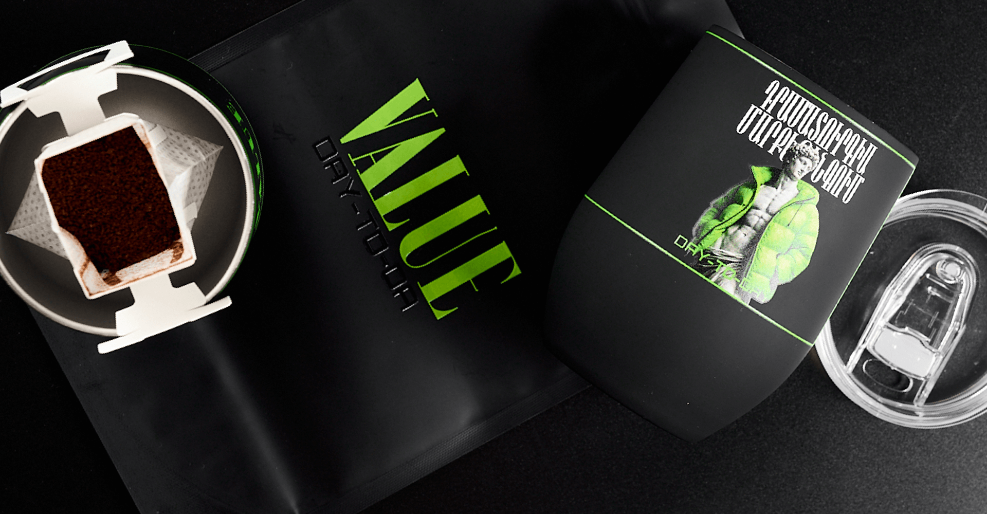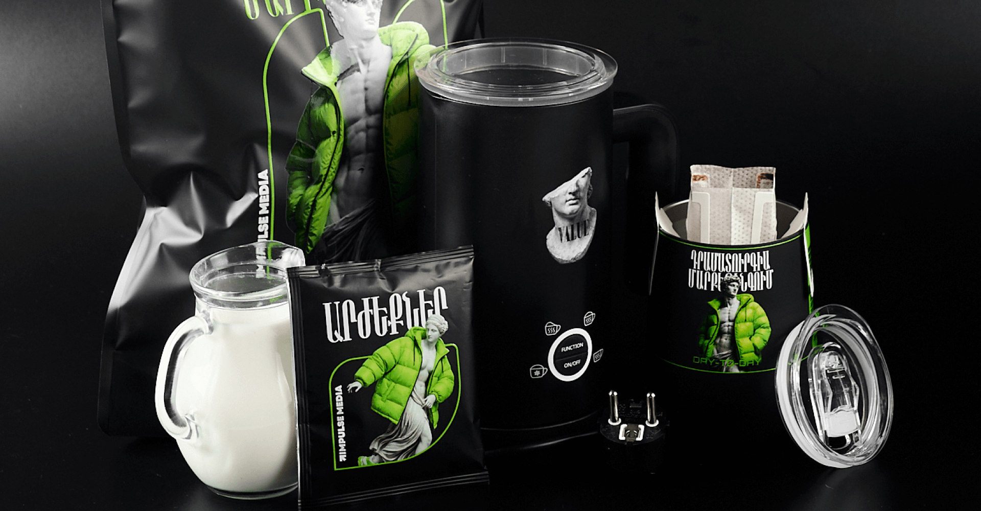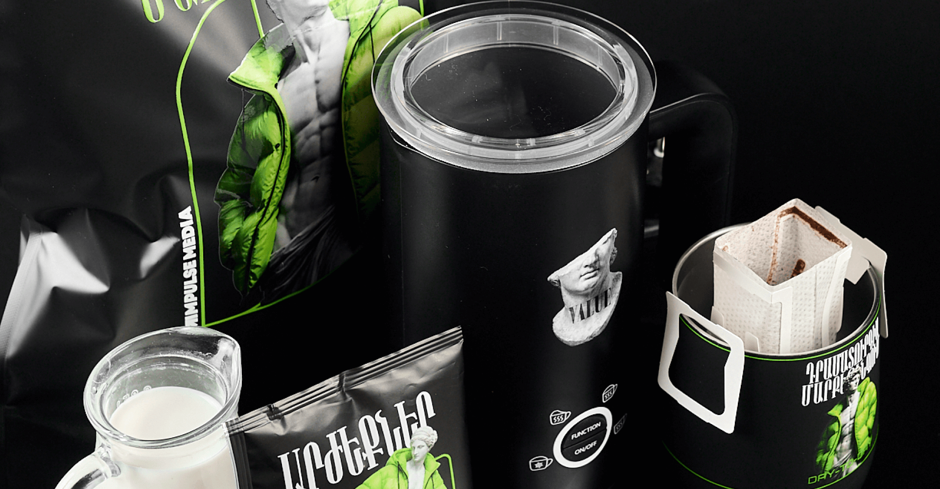 Coffee set with a Creamistry electric milk frother, a branded thermal mug with UV printing and three servings of natural coffee in drip bags.
