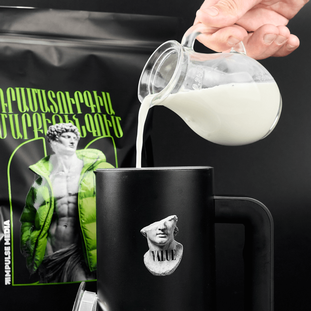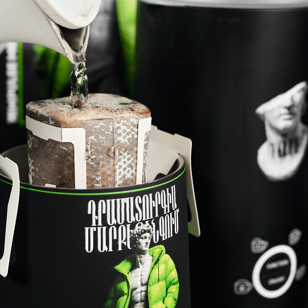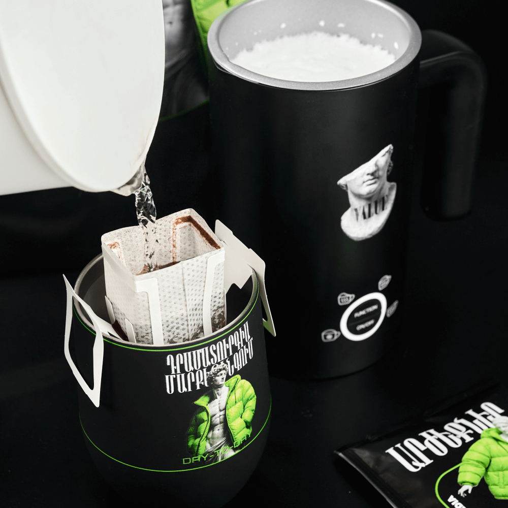 The set includes 3 bags of natural ground coffee in drip bags with branded packaging. This format is convenient on the road and in the office, does not require accessories and allows you to brew coffee directly in a branded mug. A gift set with a cappuccino maker and drip coffee is suitable as a gift for employees, colleagues, partners and clients, and will strengthen the HR brand and visual presence of the company.