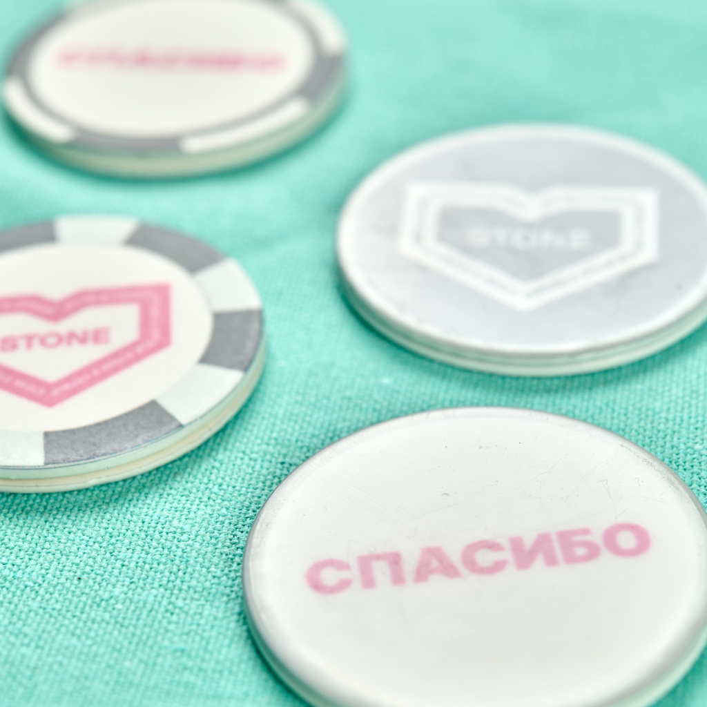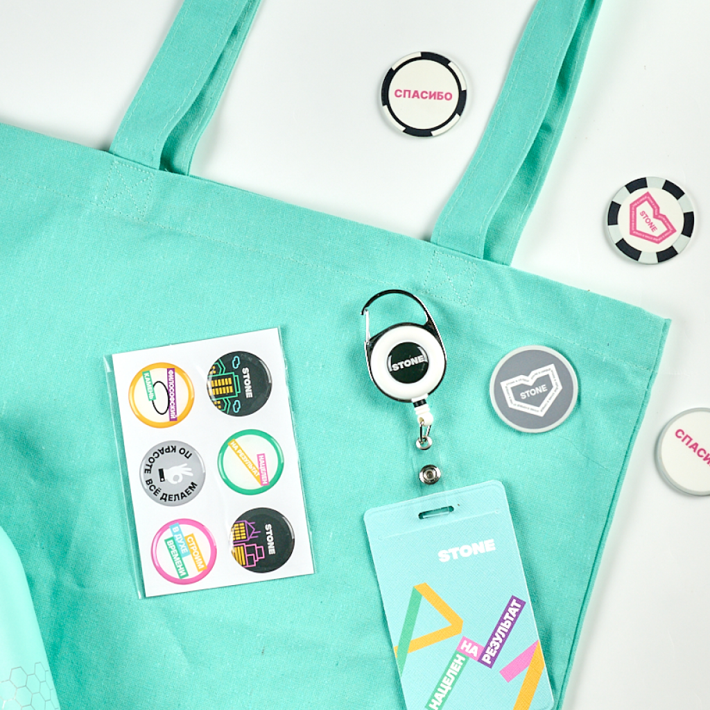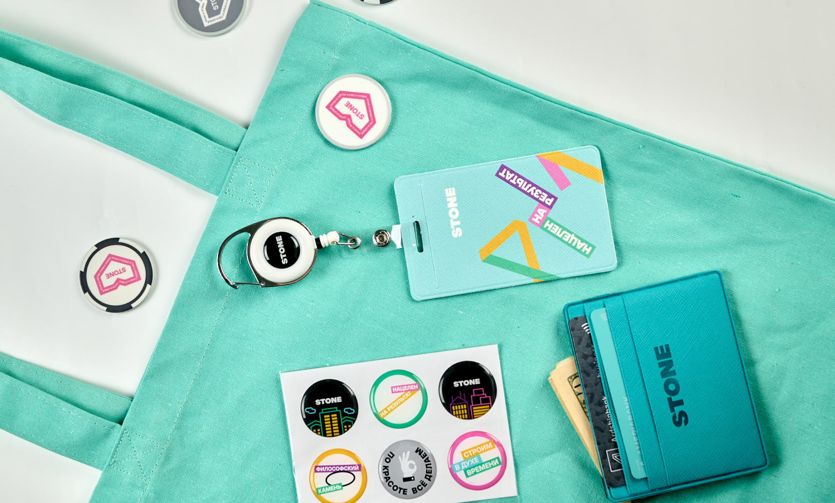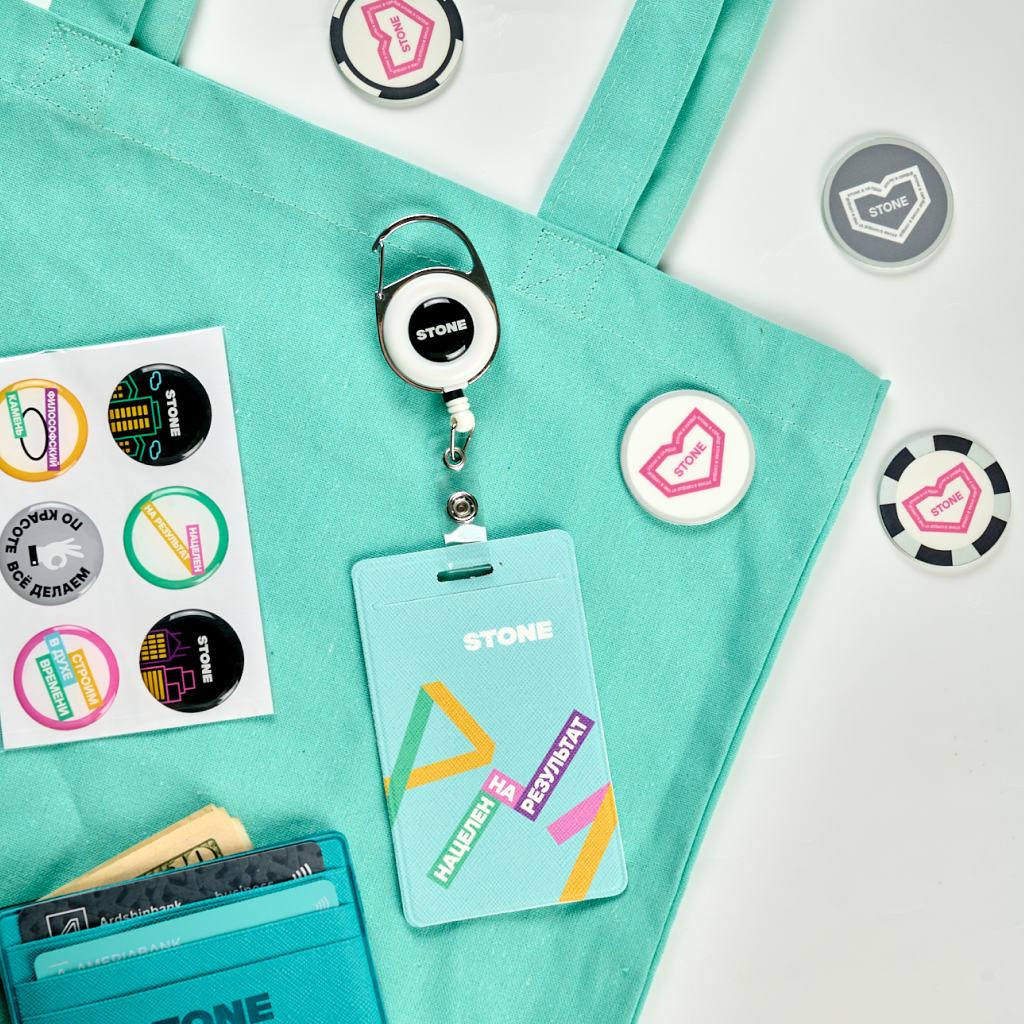 The project was implemented in a comprehensive manner: from design development to the production of corporate gifts. The shopper is made of 100% cotton with a density of 250 g with a silk-screened logo, the chips are made of metal with a varnish coating, and the stickers and retractors are decorated with resin stickers. This approach allowed us to create durable branded accessories that make Stone stand out. Impulse Media offers a full cycle of work: design, production and custom-made corporate gifts.