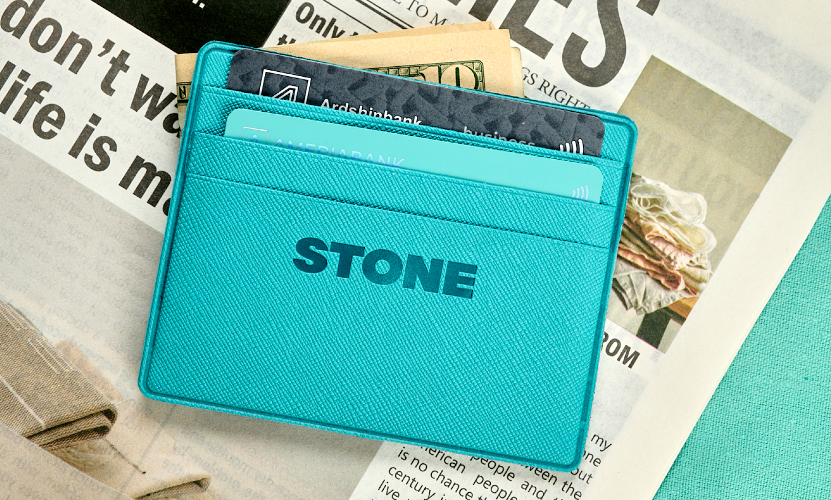 Stone merchandise: embossed card holder, shopper, badge case, poker chips and stickers. An exclusive corporate set that emphasizes the uniqueness of the brand.