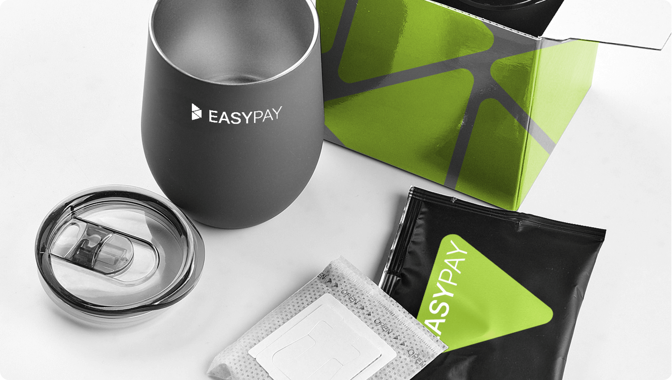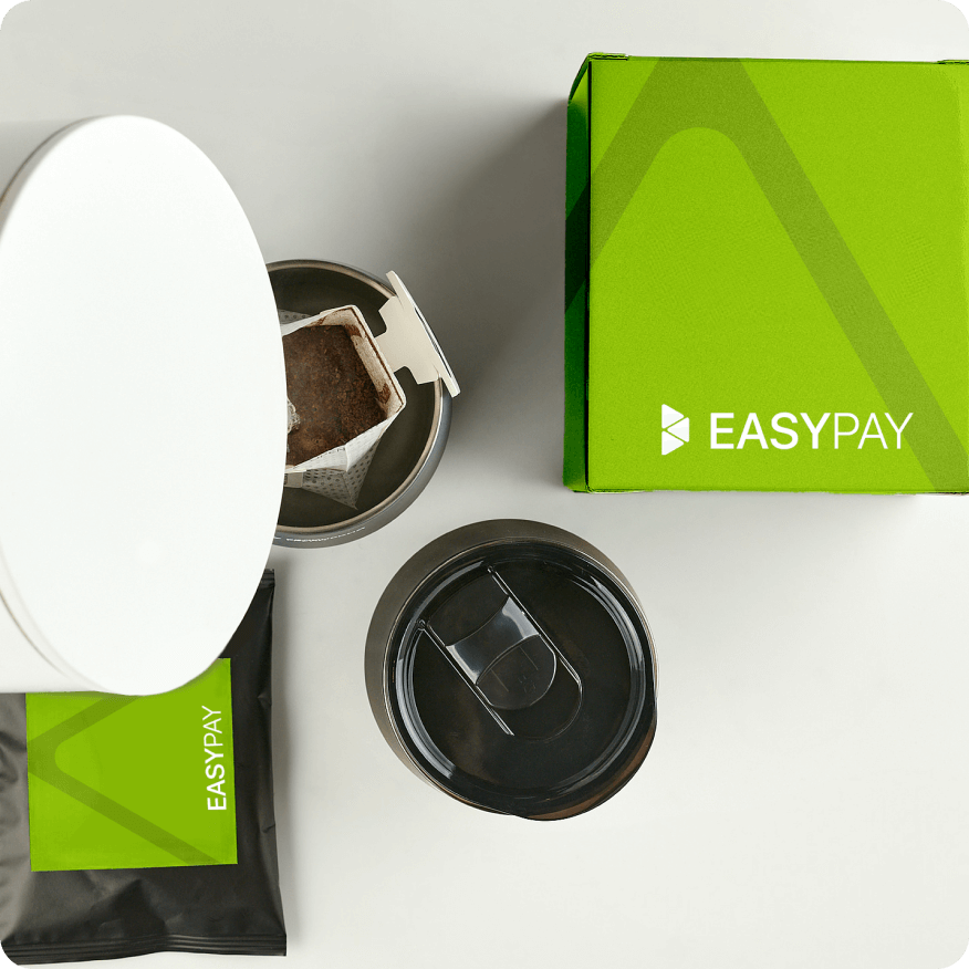 Welcome Pack for EasyPay from Impulse Media: thermal cup, drip coffee, anti-stress and notepad. The organizer folder combines all items into a single whole.