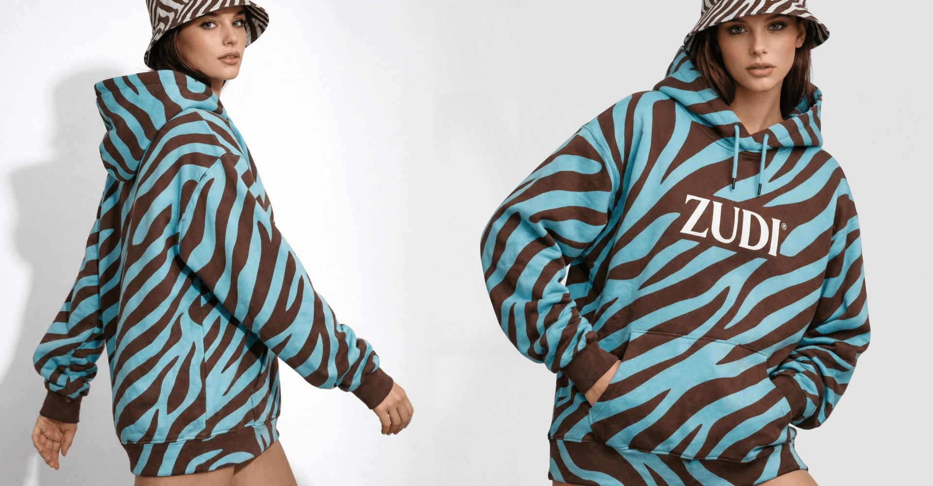 Custom-made Panama hats and printed hoodies. Trendy fashion merch collection with oversized patterns, strong branding and modern fabric printing technologies in the cut