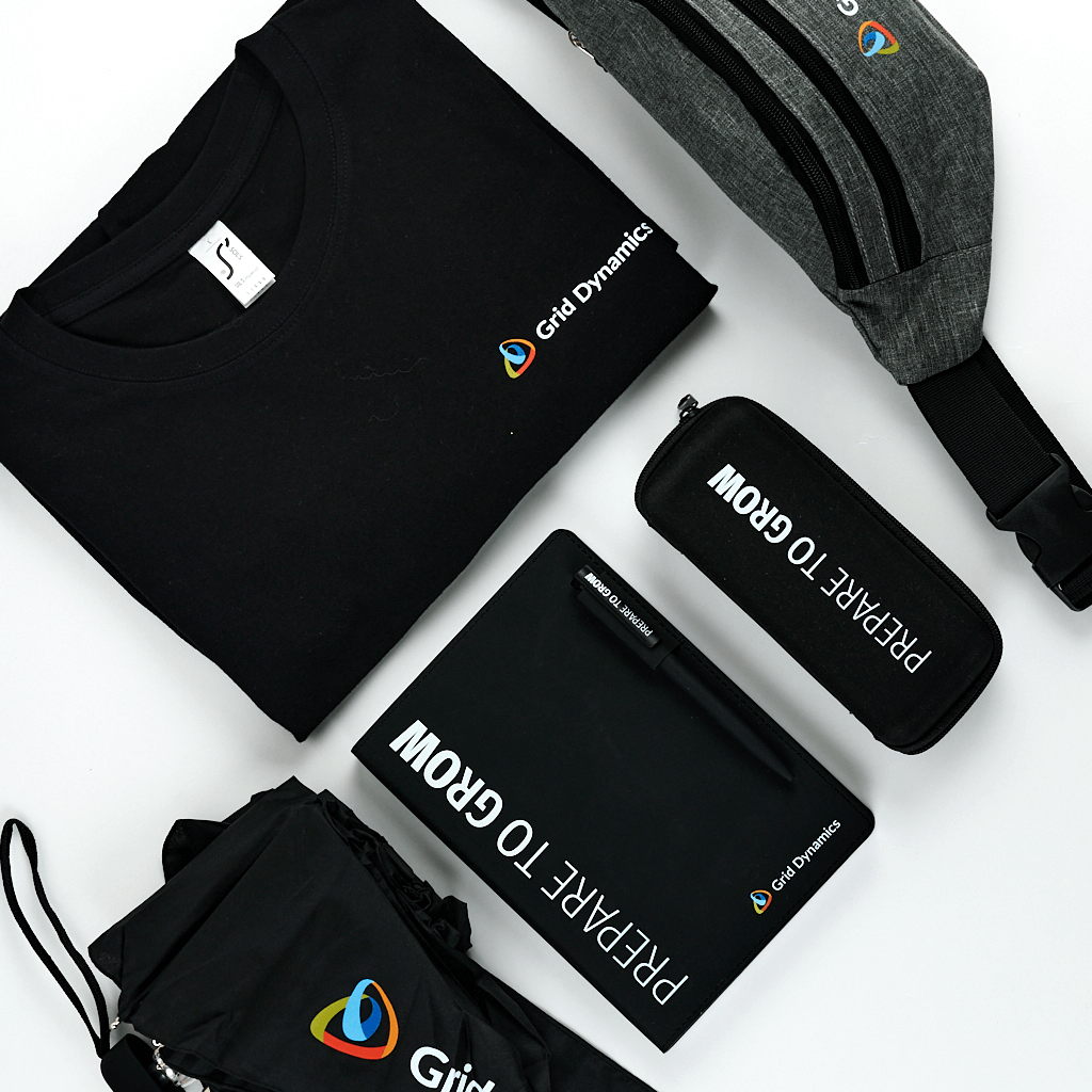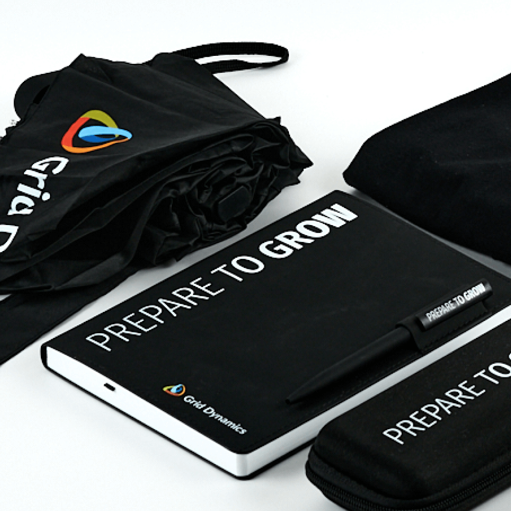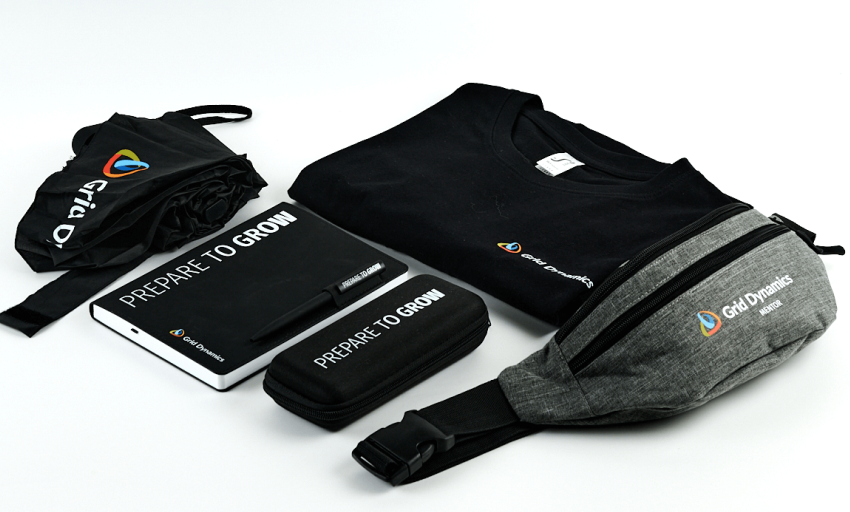 Stylish Grid Dynamics set for employees and partners: T-shirt, bag, umbrella, pencil case, notepad and pen with the slogan Prepare to Grow. Functional merch.