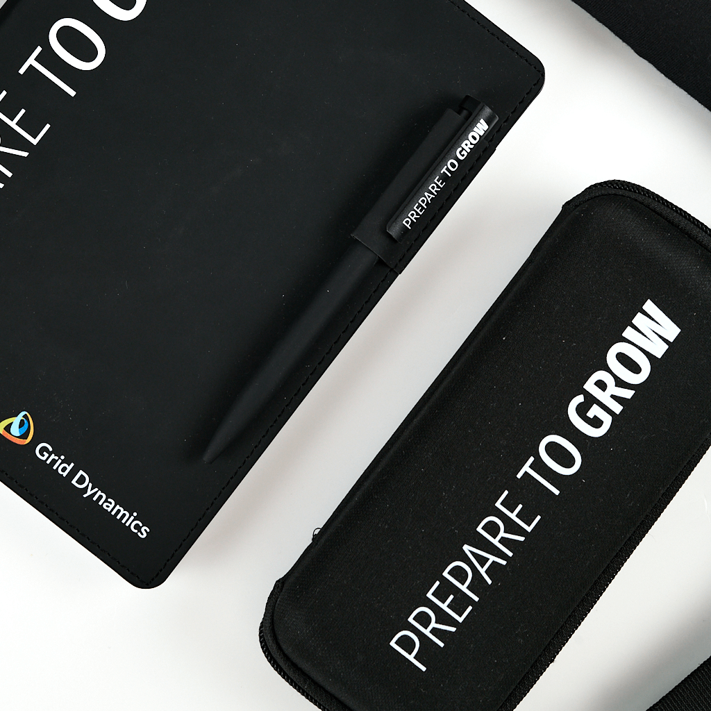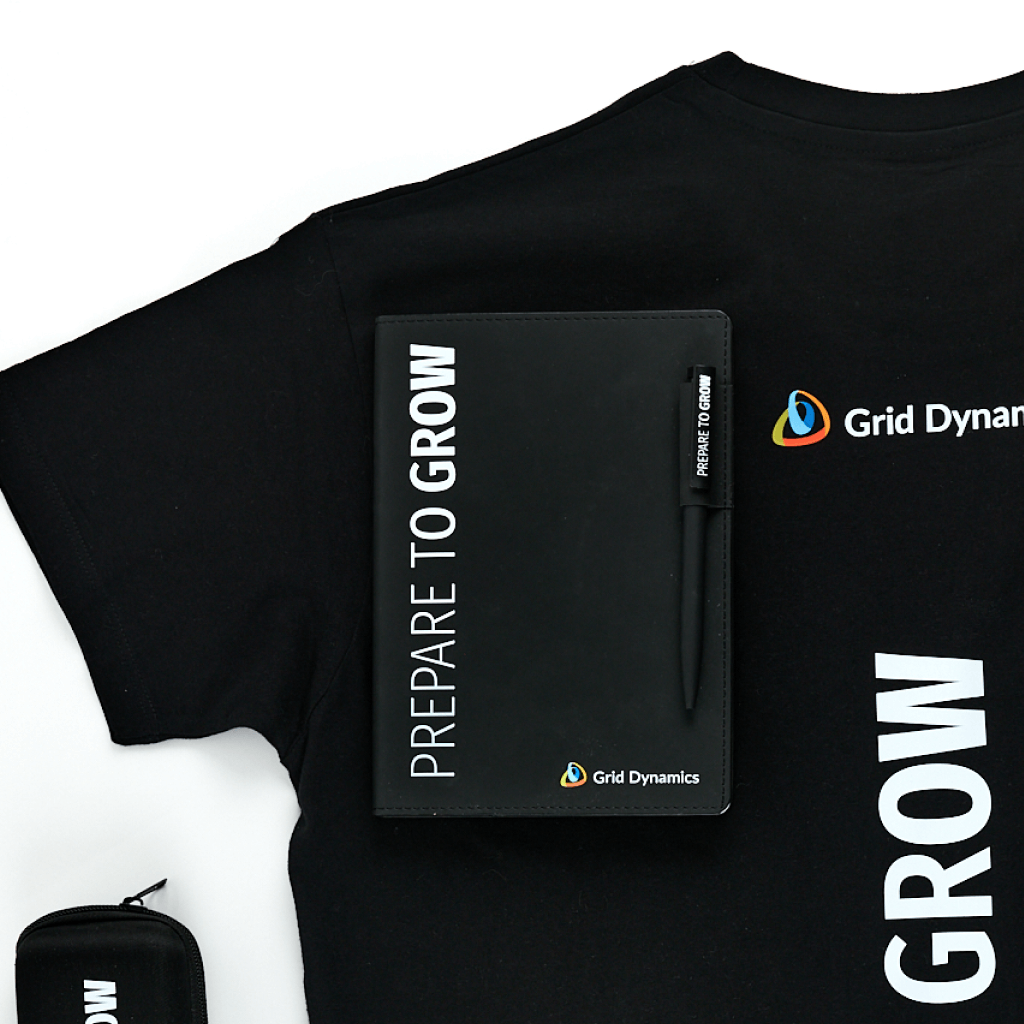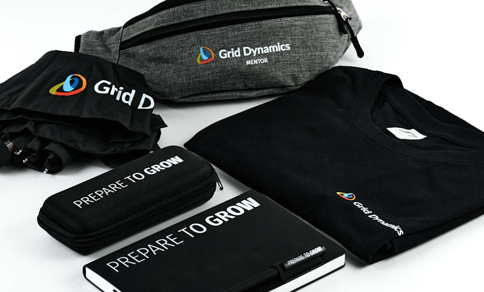 Stylish Grid Dynamics set for employees and partners: T-shirt, bag, umbrella, pencil case, notepad and pen with the slogan Prepare to Grow. Functional merch.