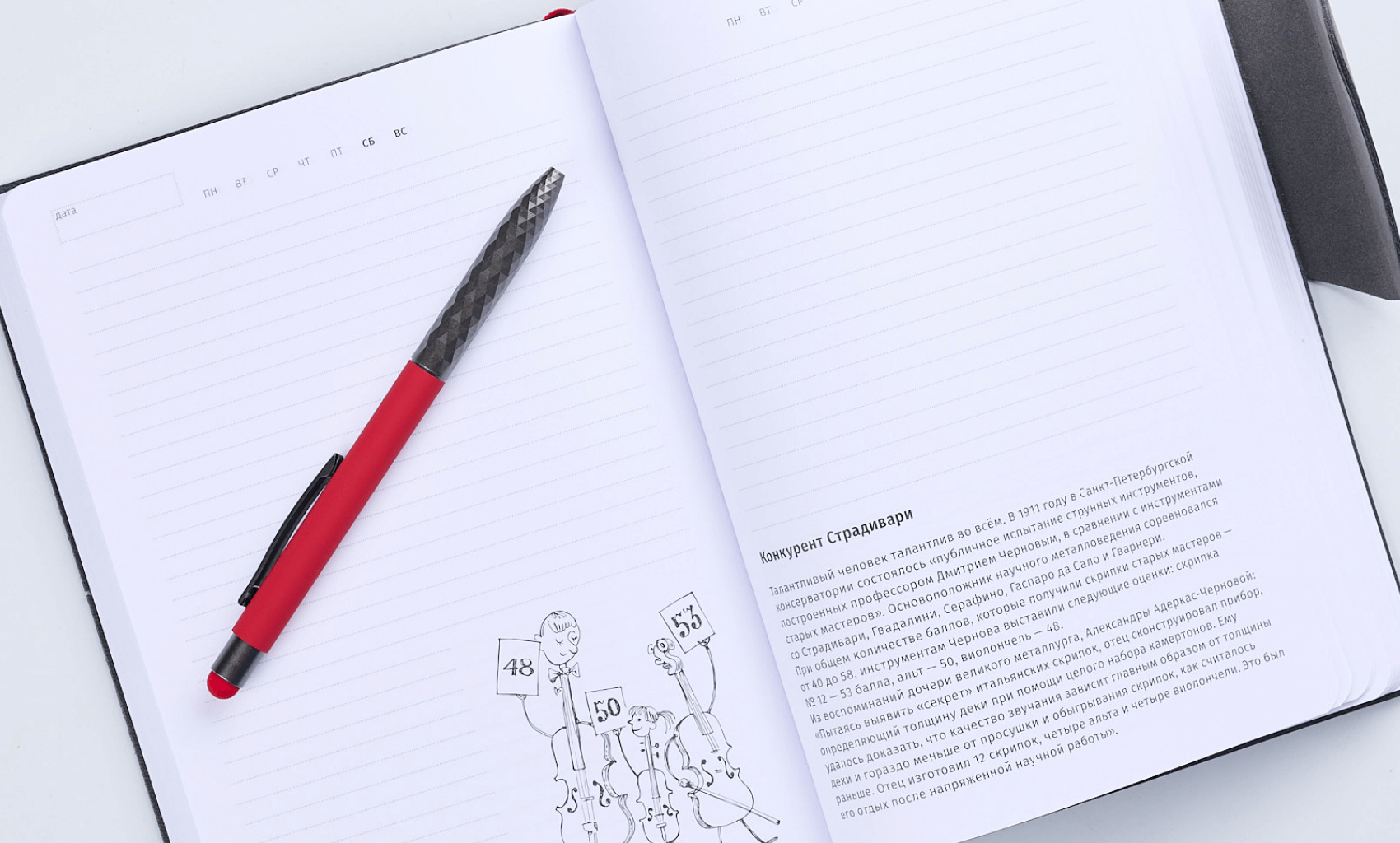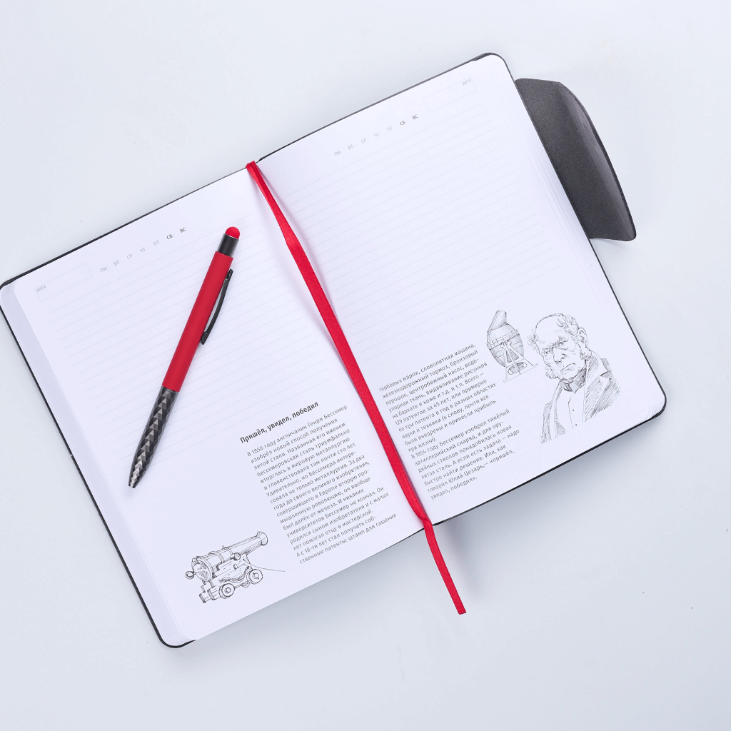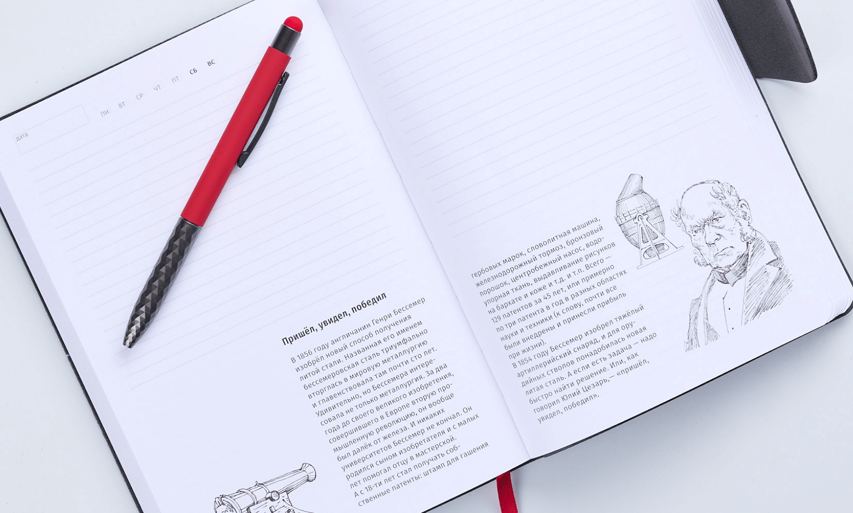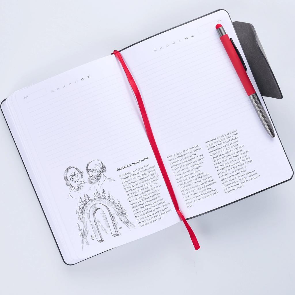 This corporate diary combines aesthetics and functionality. It is convenient to take notes, plan tasks and work with documents. Illustrated pages with historical facts create an engagement effect and motivate employees. The diary becomes not just a working tool, but an element of corporate culture, building respect for the brand.