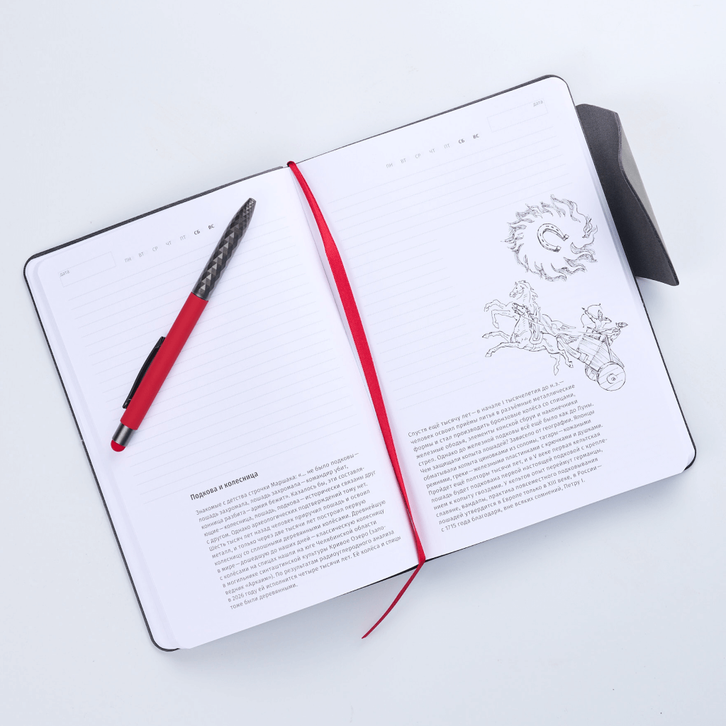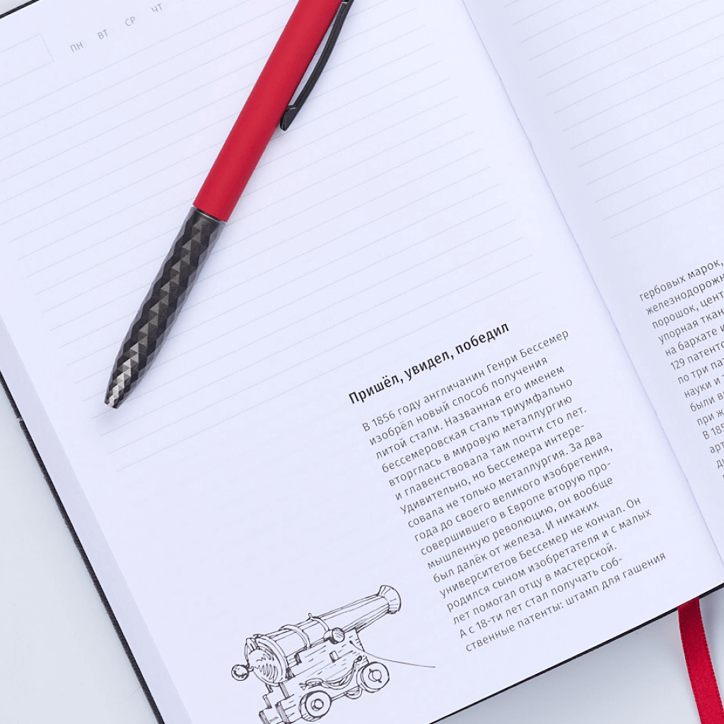 This project is not just a diary with a logo, but a full-fledged corporate tool that combines aesthetics and functionality. A strict graphite cover with a soft texture, blind embossing and red foil accents create a premium image. Inside is a unique block with illustrations and historical notes, making writing not a chore, but an exciting process.