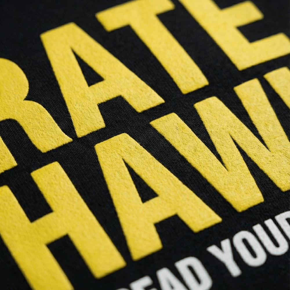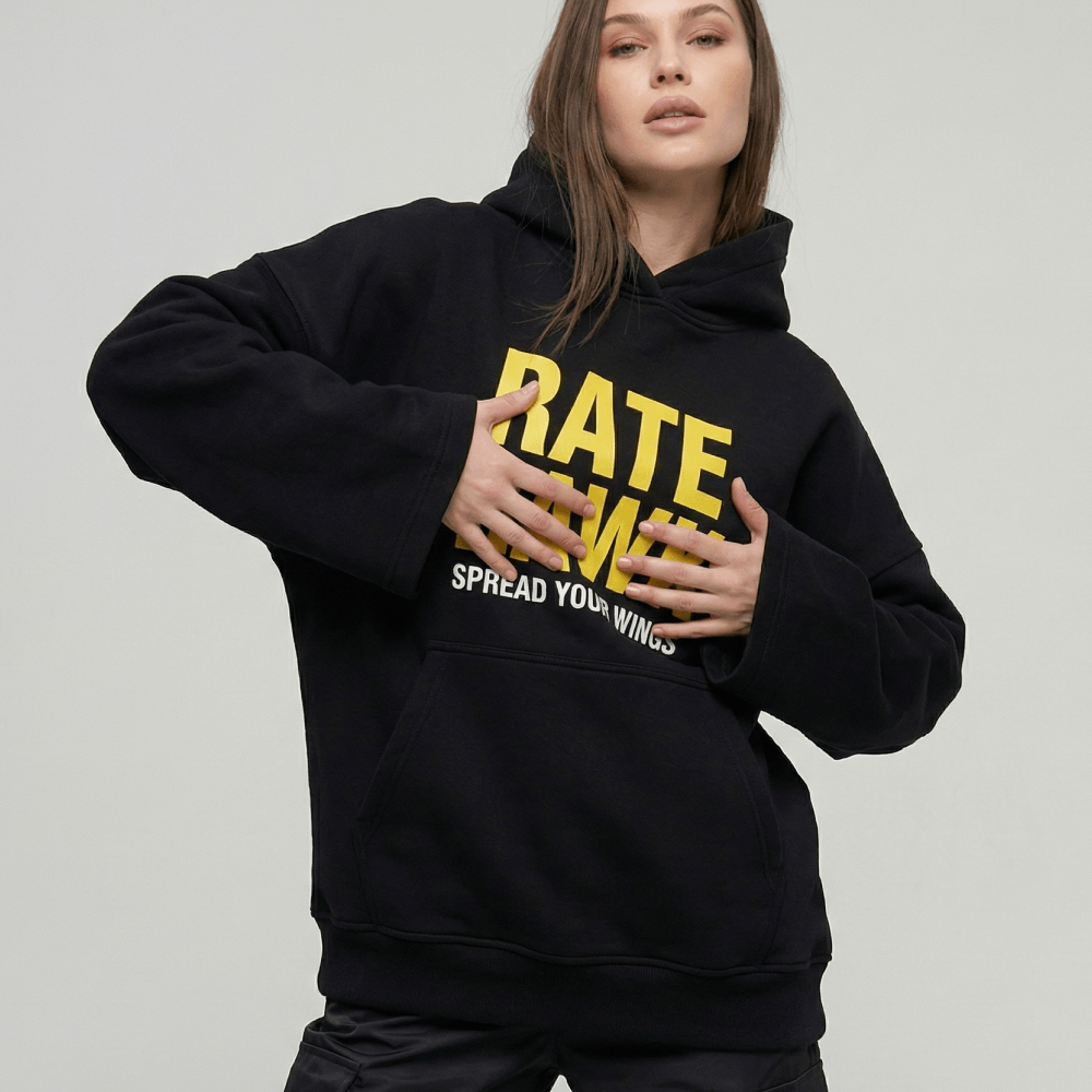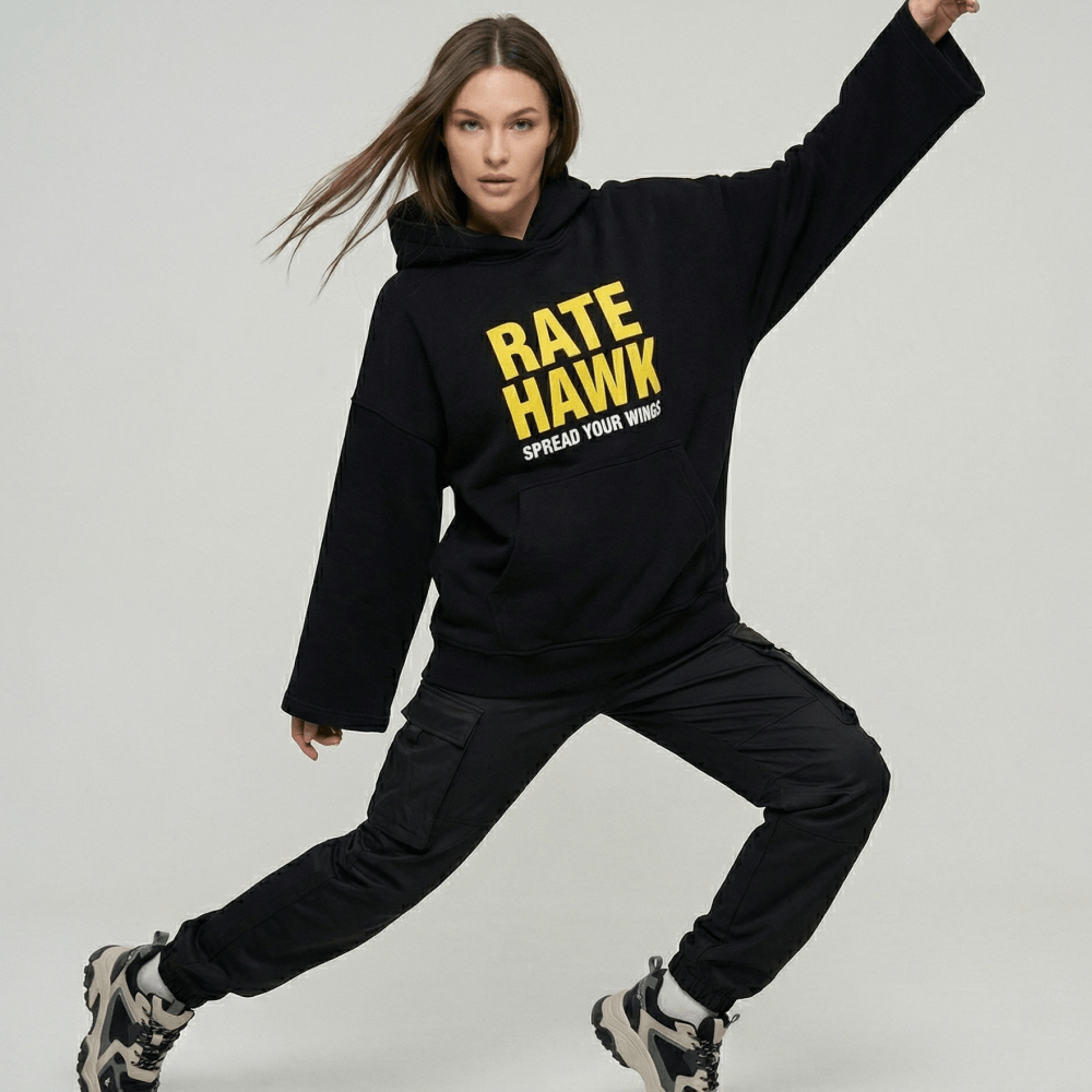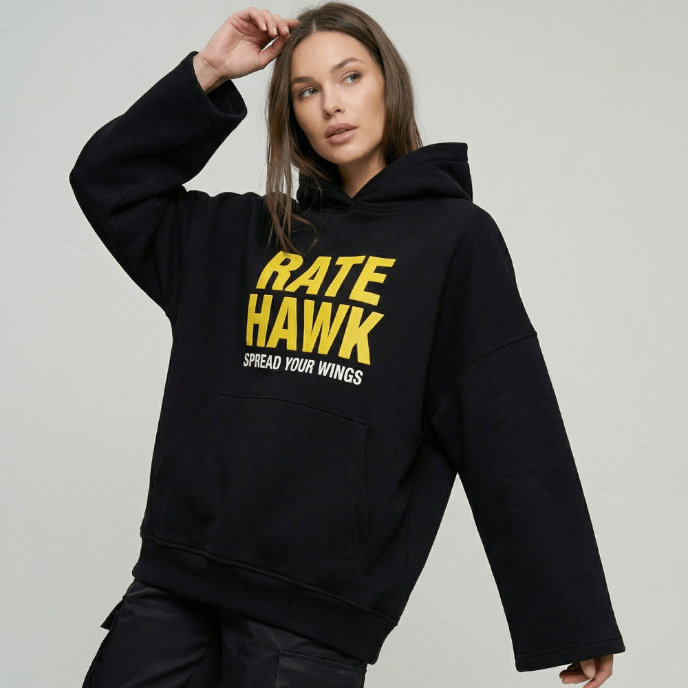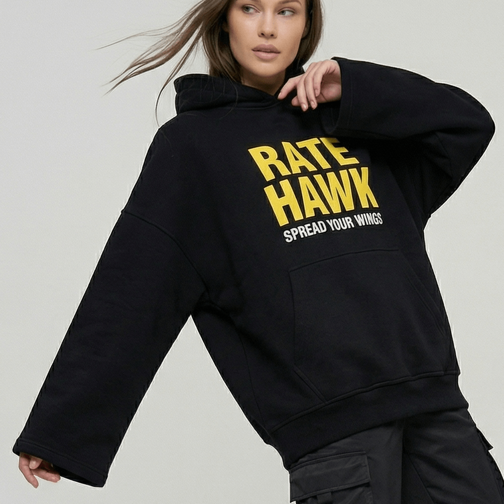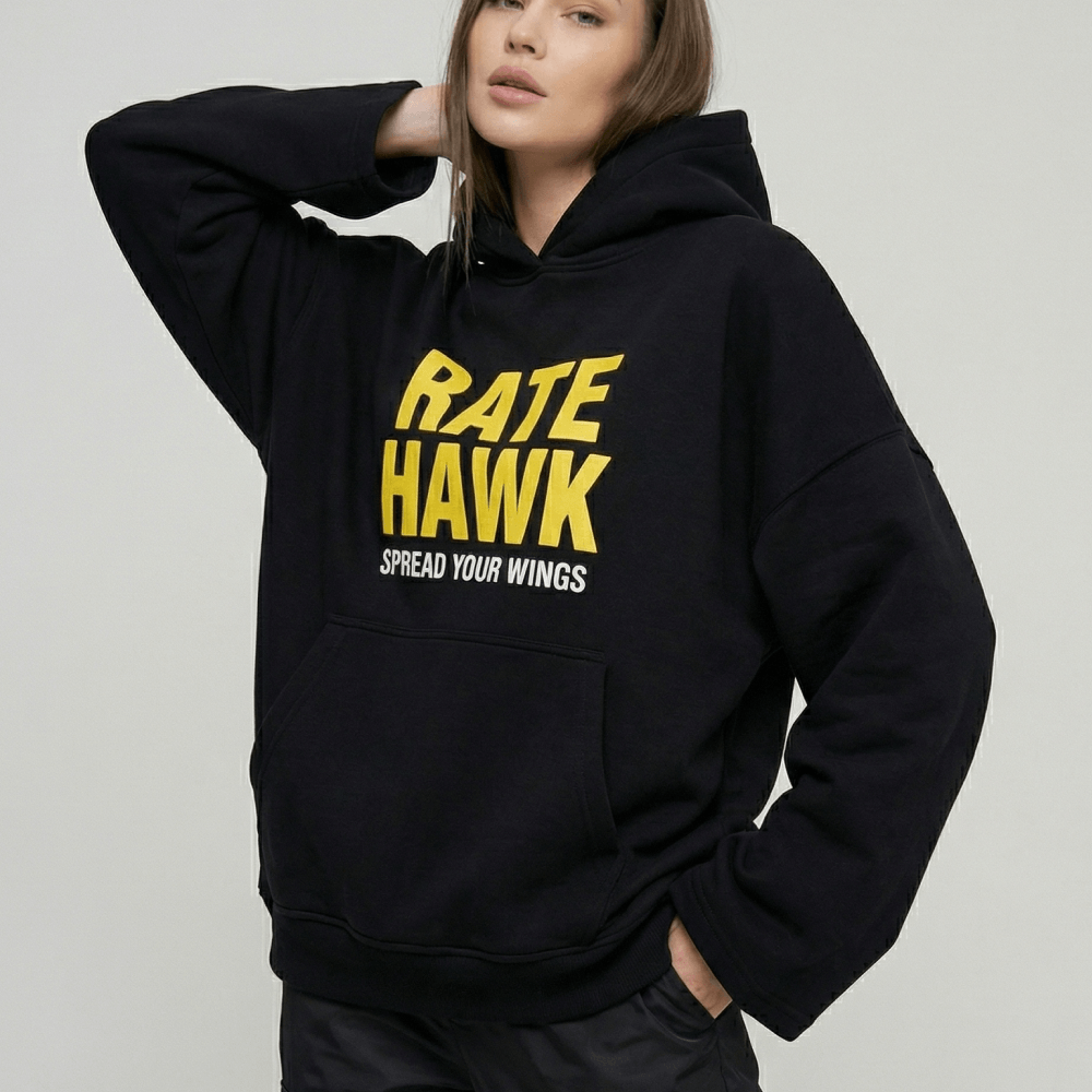 In fashion merch, you can’t just put the logo in the center. Proper brand integration is important. The bright yellow RateHawk print and Spread Your Wings motto contrast coolly against the black background. These graphics work cleanly and harmoniously. As a result, the hoodie doesn't look like a boring uniform, but like a full-fledged designer streetwear for your life.