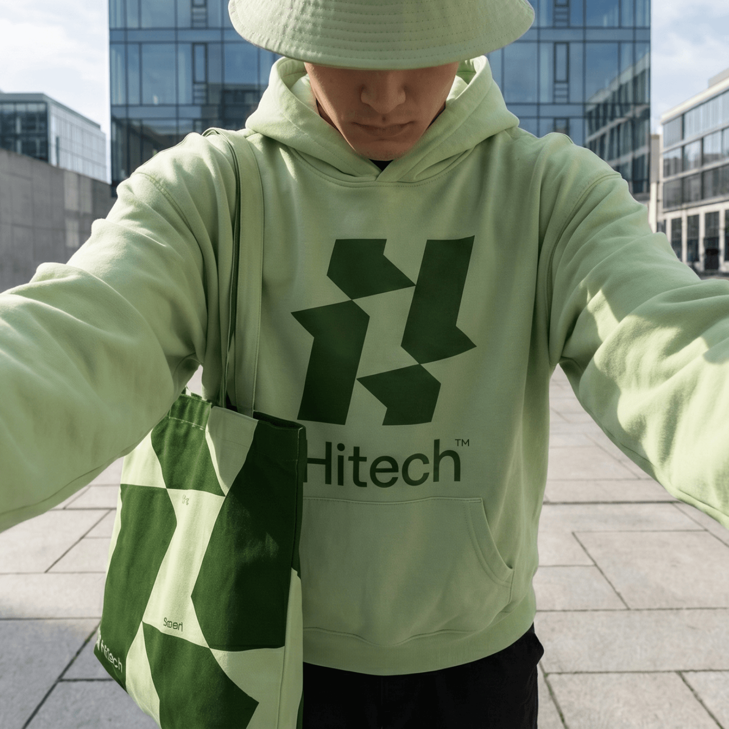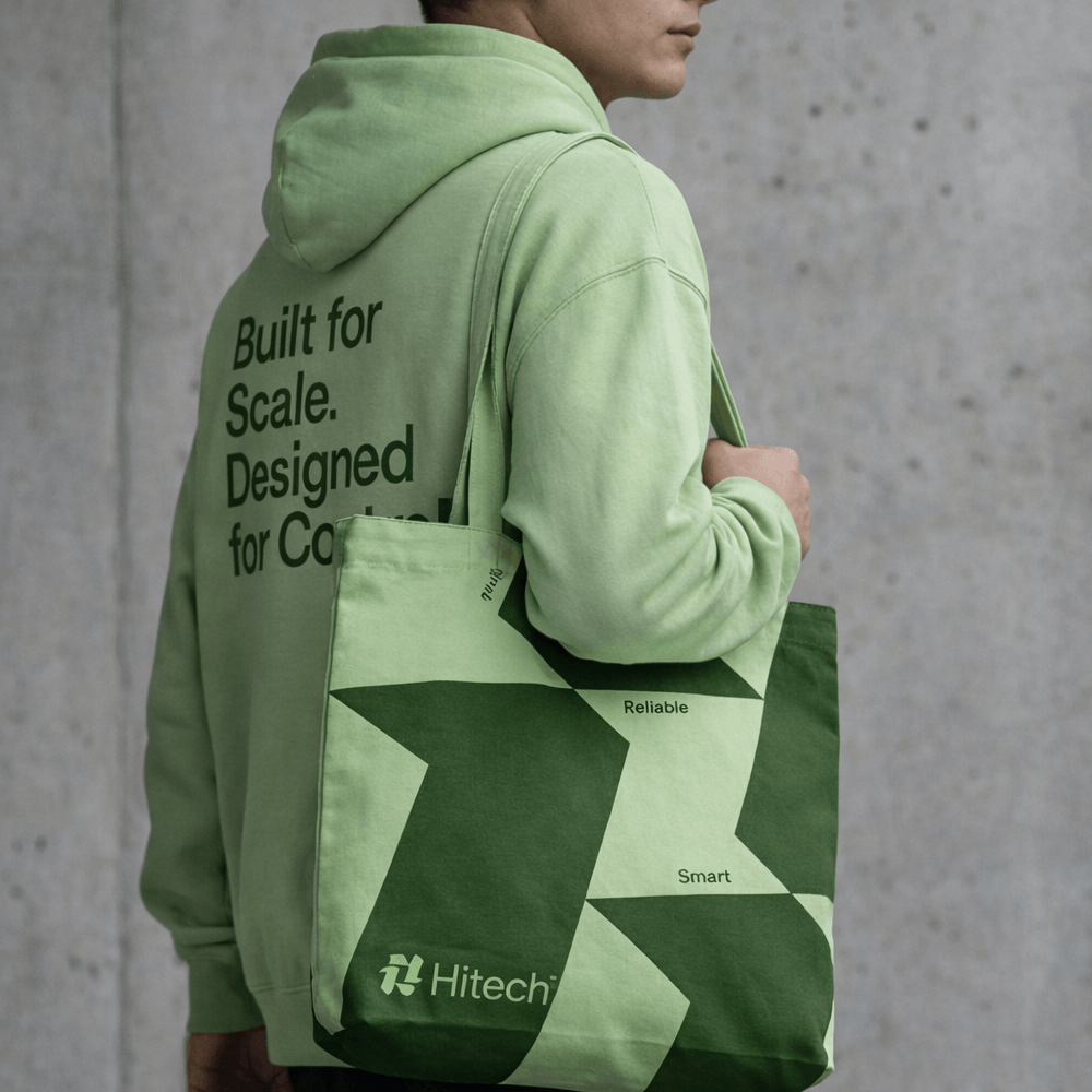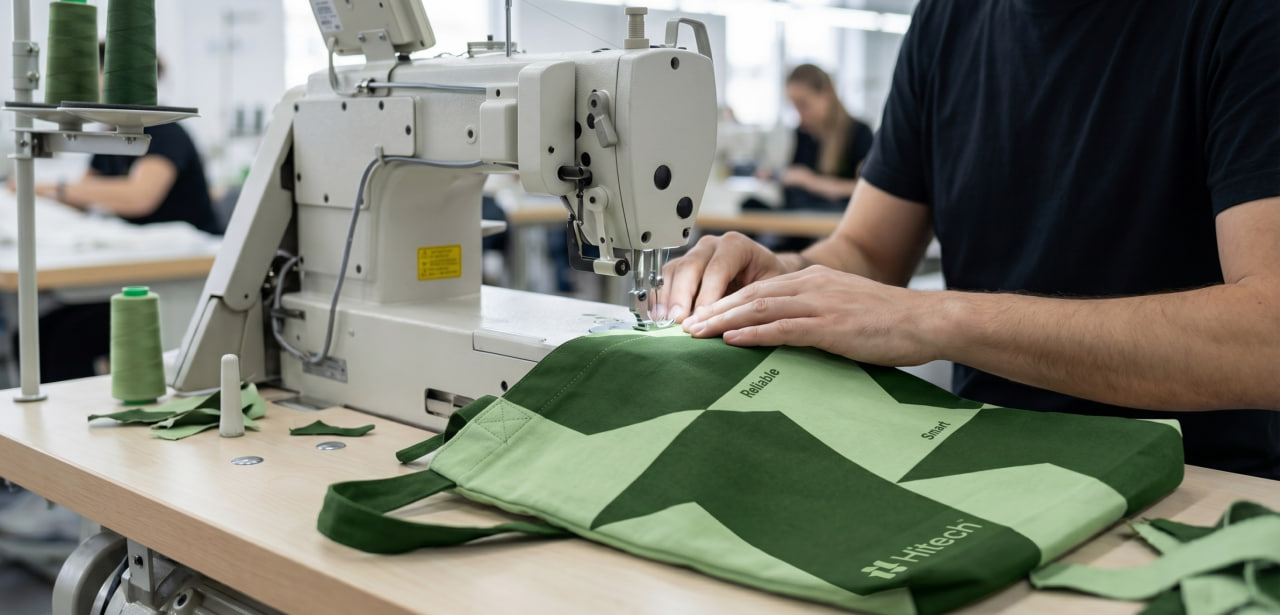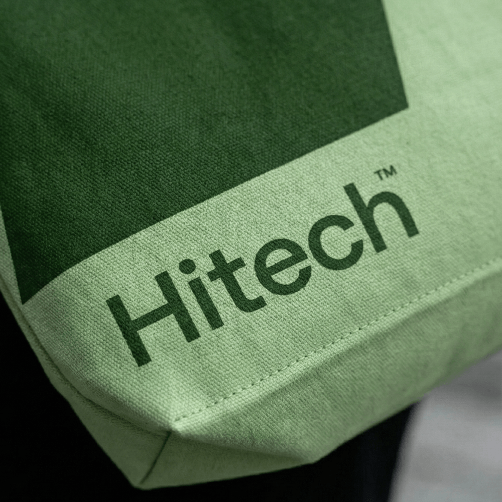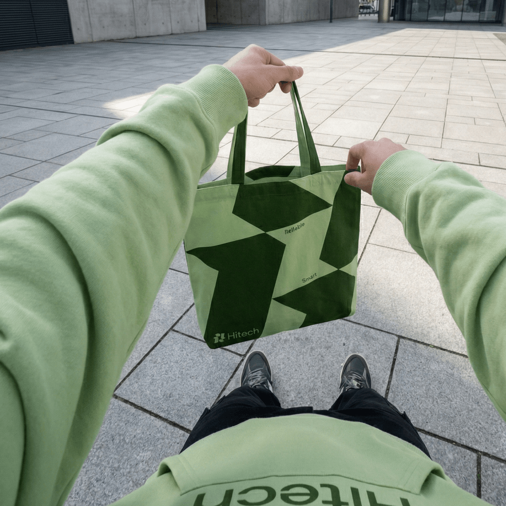 The shopper was also tailored specifically for the project. For it, we used fabric with a density of 260 g/m² and applied graphics using the sublimation method in the cut. This made it possible to obtain a durable full-color print with accurate shape and color reproduction. Thanks to individual tailoring, a branded palette and large graphics, the shopper has become not just packaging or a souvenir, but a full-fledged part of the Hitech fashion merch collection.