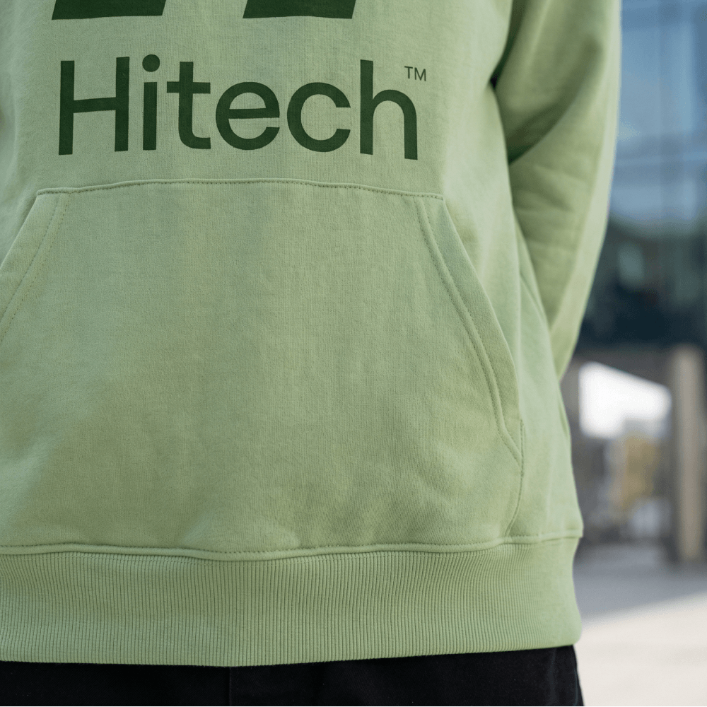 We produced and sewed hoodies for Hitech to order in order to accurately match the corporate color and maintain the uniform character of the entire line. The model is made of dense 3-thread footer, density 250 g/m², composition 80% cotton and 20% polyester. This material holds its shape well, is comfortable to wear and is suitable for everyday use. Branding is done using silk-screen printing: the logo looks clean, contrasting and durable works on fabric.