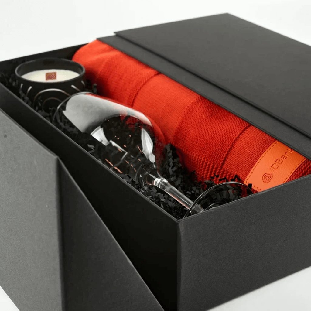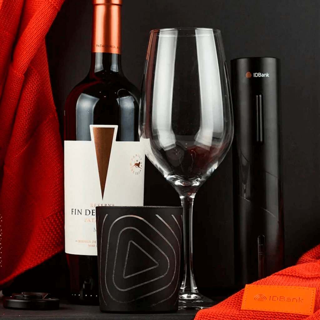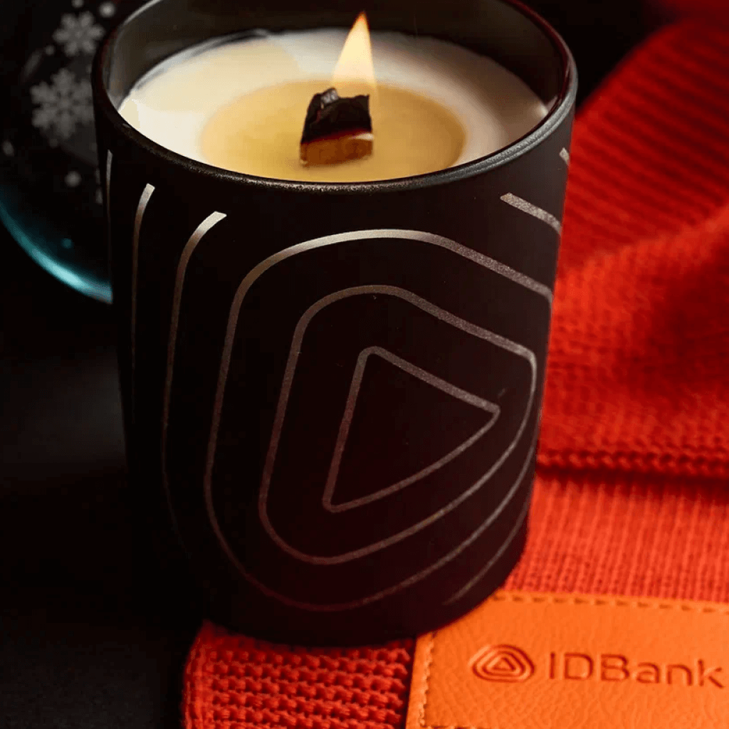 The box contains a soft cotton blanket measuring 90x150 cm in bright orange, a wine glass and an electronic corkscrew. For a cozy touch, we added a sandalwood scented candle with a wooden wick. The black candlestick has a circular engraving in the style of the company logo - a detail that makes the gift especially atmospheric. The presented products are demonstration samples created to demonstrate the design and application technologies. The use of logos is for illustrative purposes only. These companies are not customers of these products.