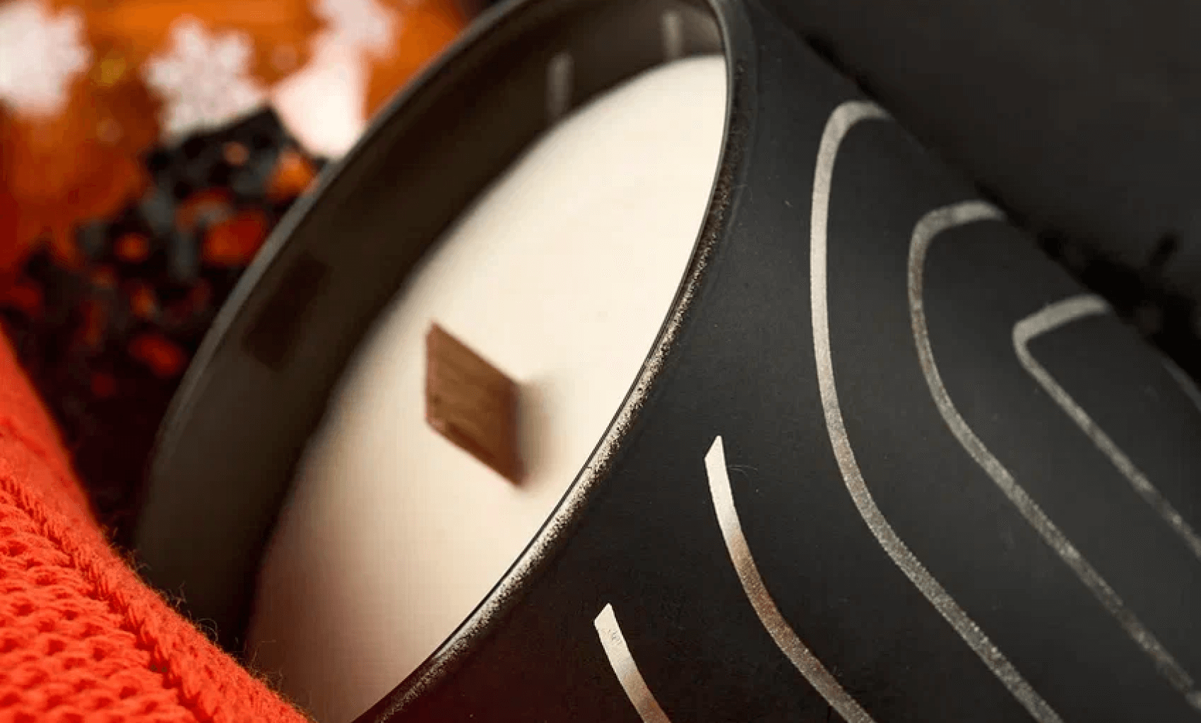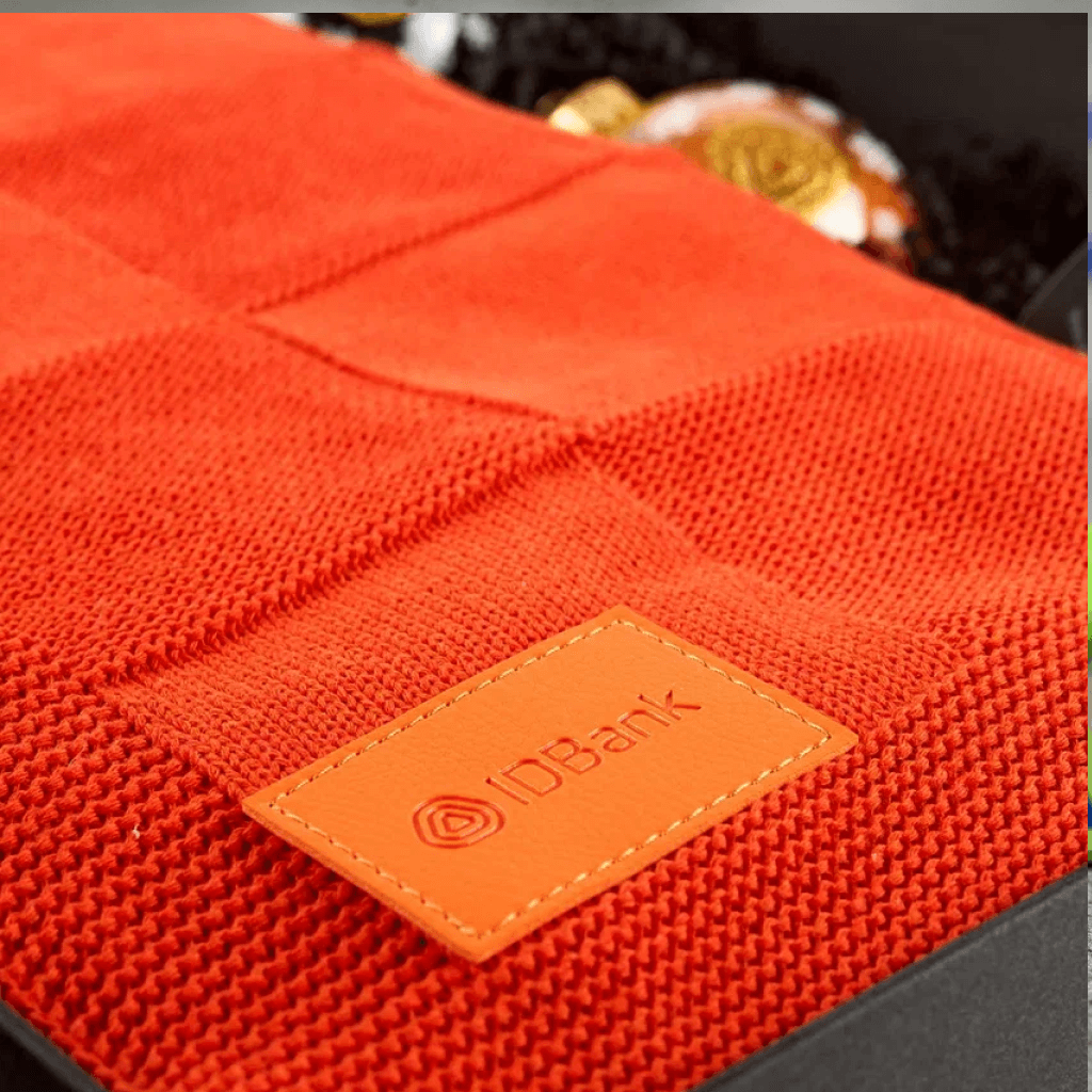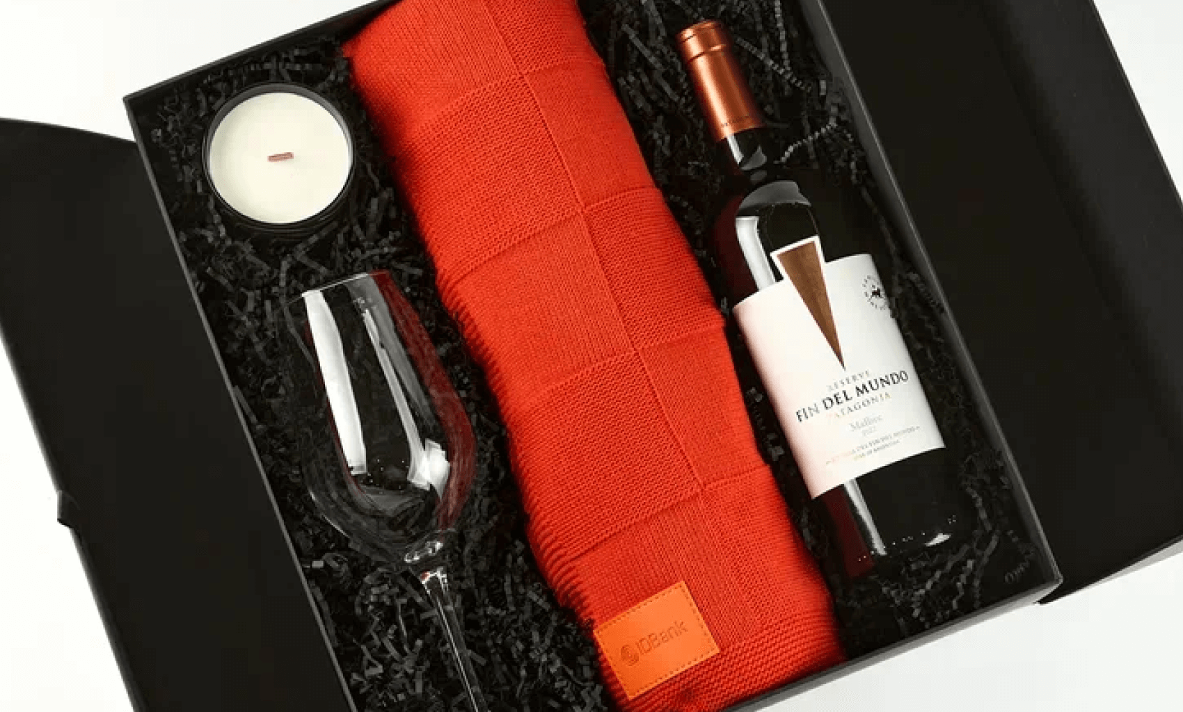The box contains a soft cotton blanket measuring 90x150 cm in bright orange, a wine glass and an electronic corkscrew. For a cozy touch, we added a sandalwood scented candle with a wooden wick. The black candlestick has a circular engraving in the style of the company logo - a detail that makes the gift especially atmospheric. The presented products are demonstration samples created to demonstrate the design and application technologies. The use of logos is for illustrative purposes only. These companies are not customers of these products.