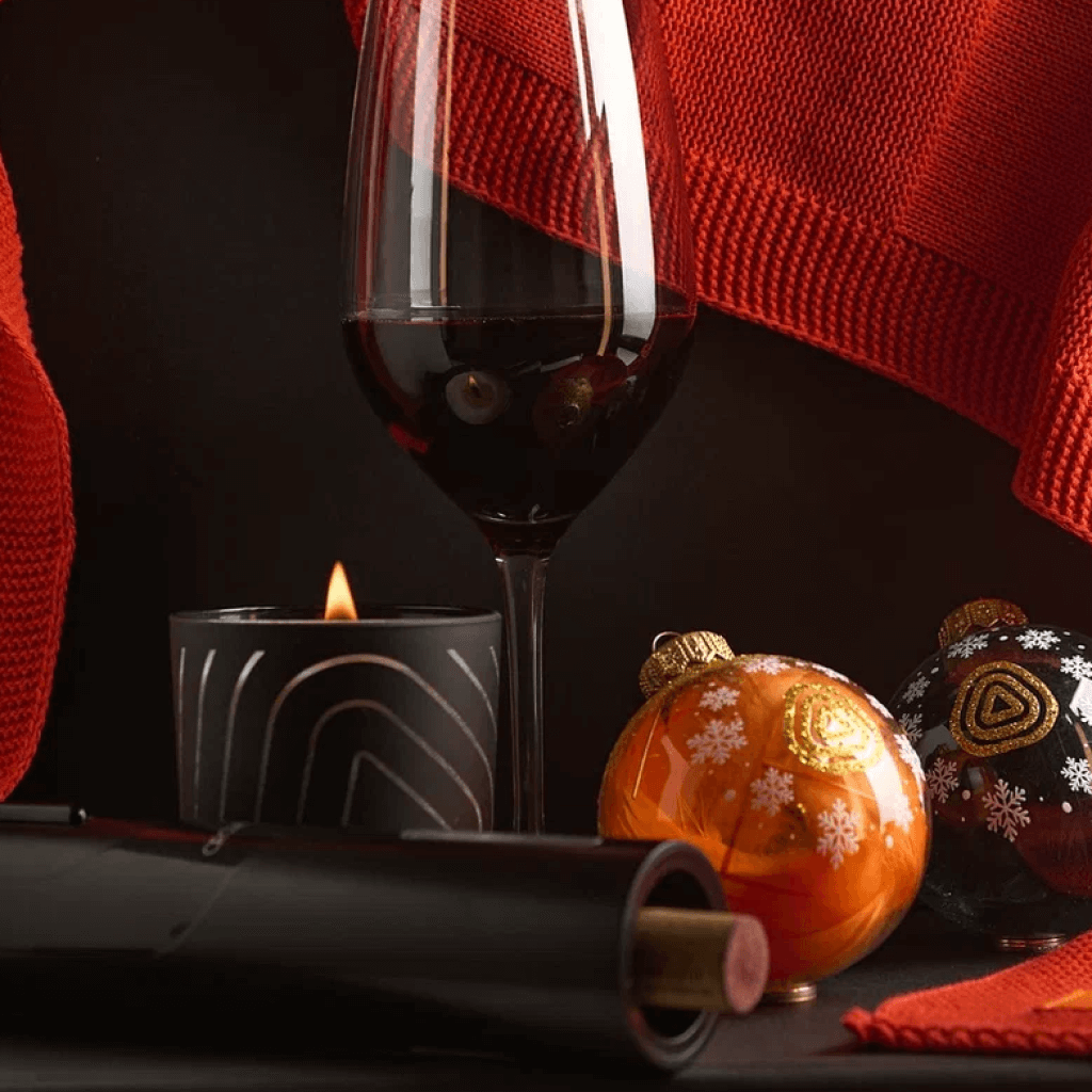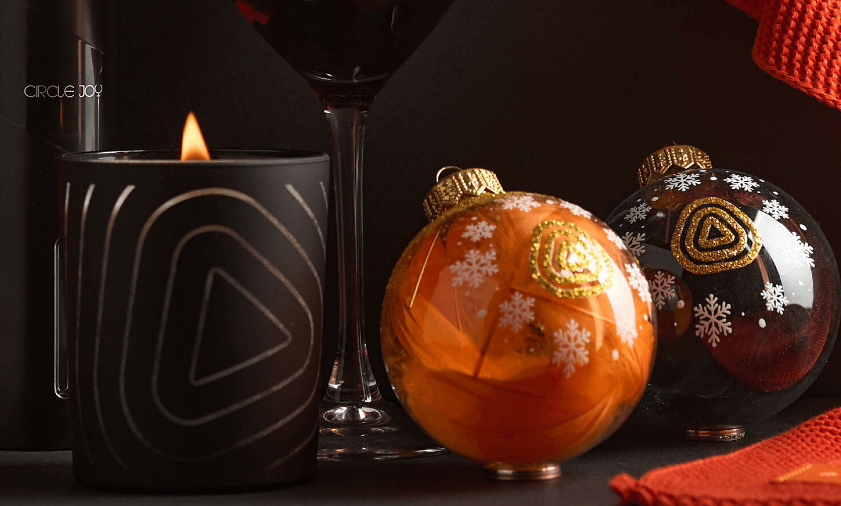 The idea for the set was born from simple but valuable moments: an evening at home, soft light, a glass of wine, a cozy blanket. Everything is built on the contrast of deep black and signature orange, creating a feeling of warmth and calm. The set also includes two Christmas tree decorations with gold decorations and snowflakes, a festive touch that completes the composition.