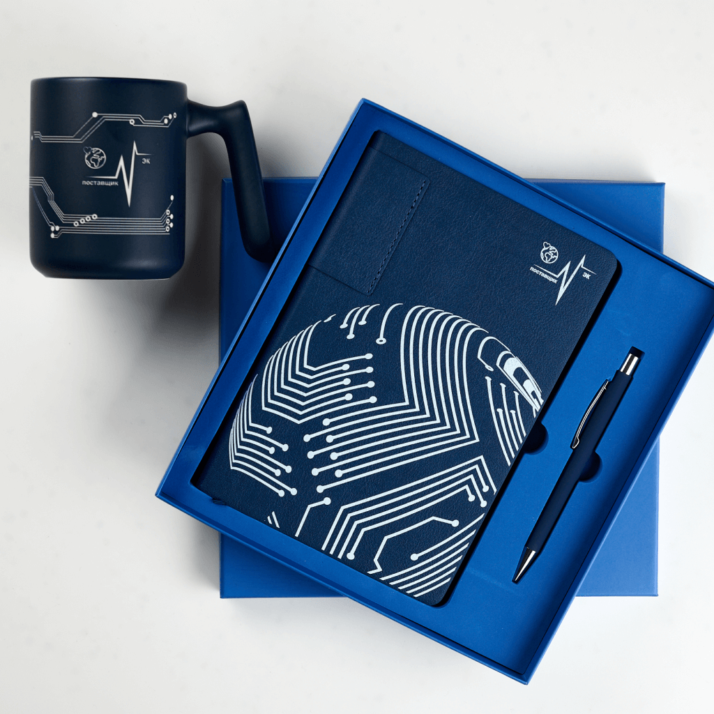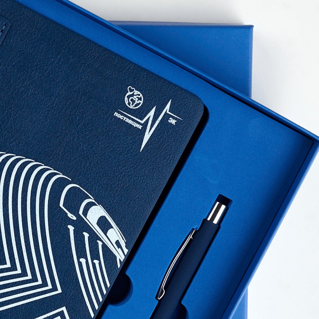 The set is packaged in a deep blue box with a tray, emphasizing the rigor and status of the gift. This solution is ideal for special occasions, conferences and meetings with partners. The packaging supports the brand's style and enhances the impression of the set.