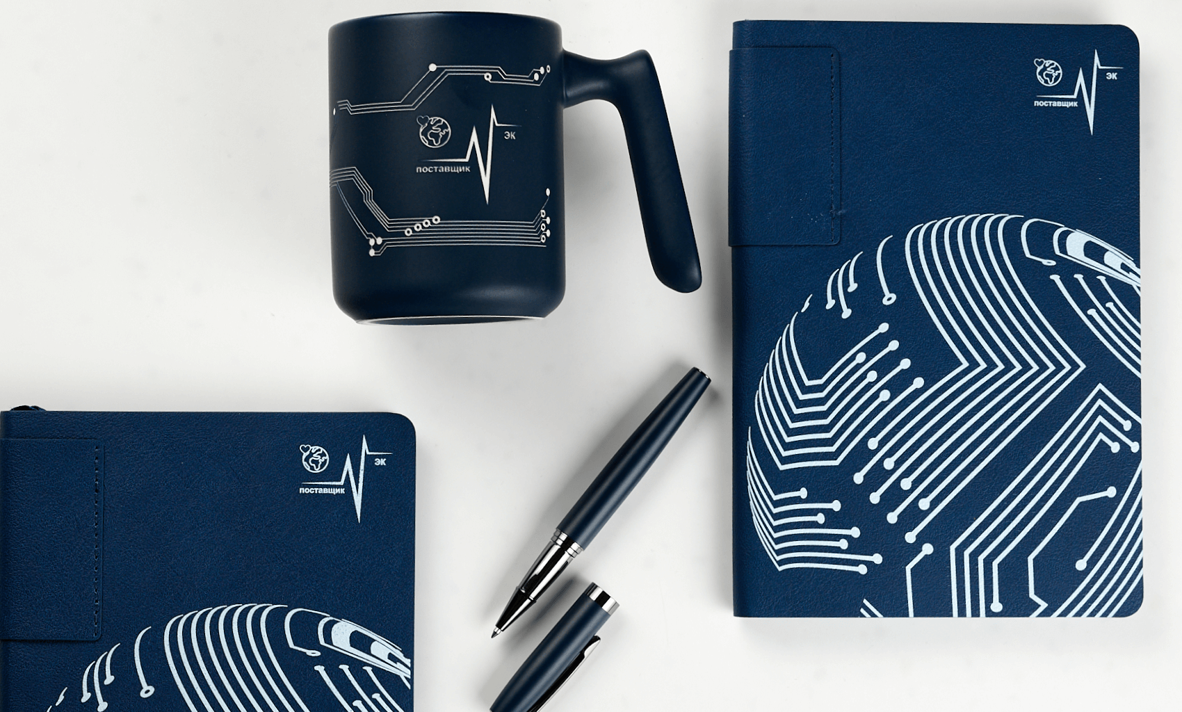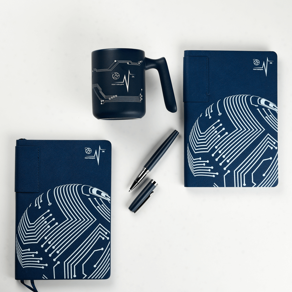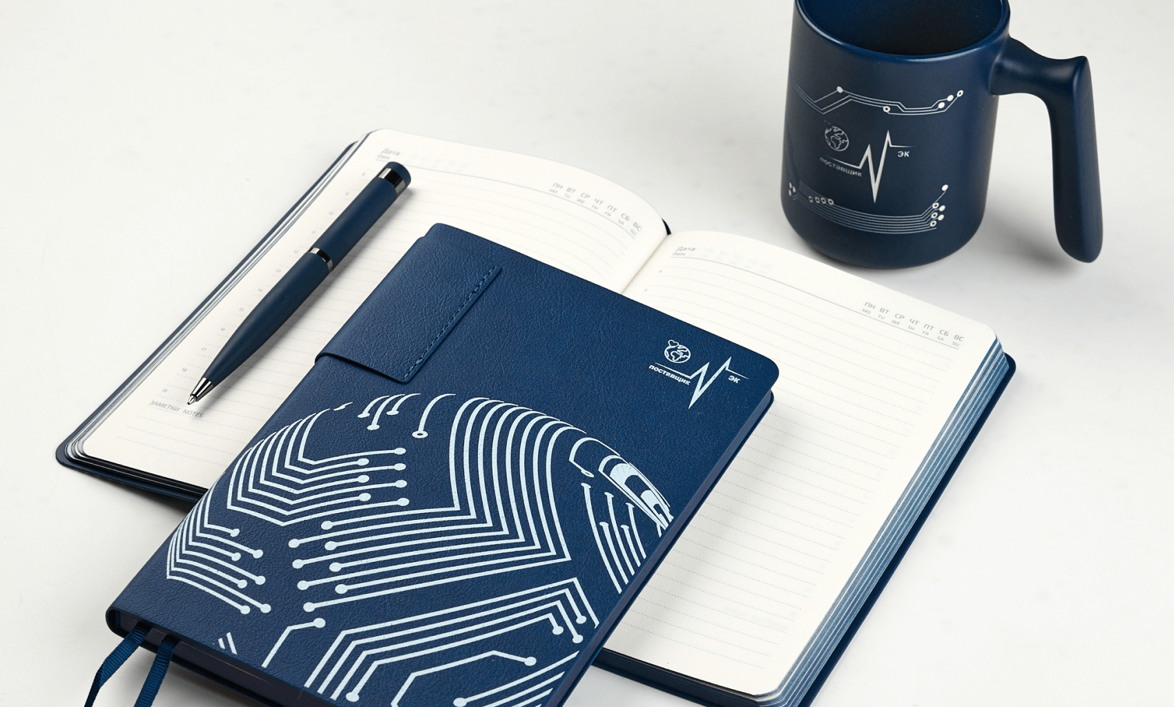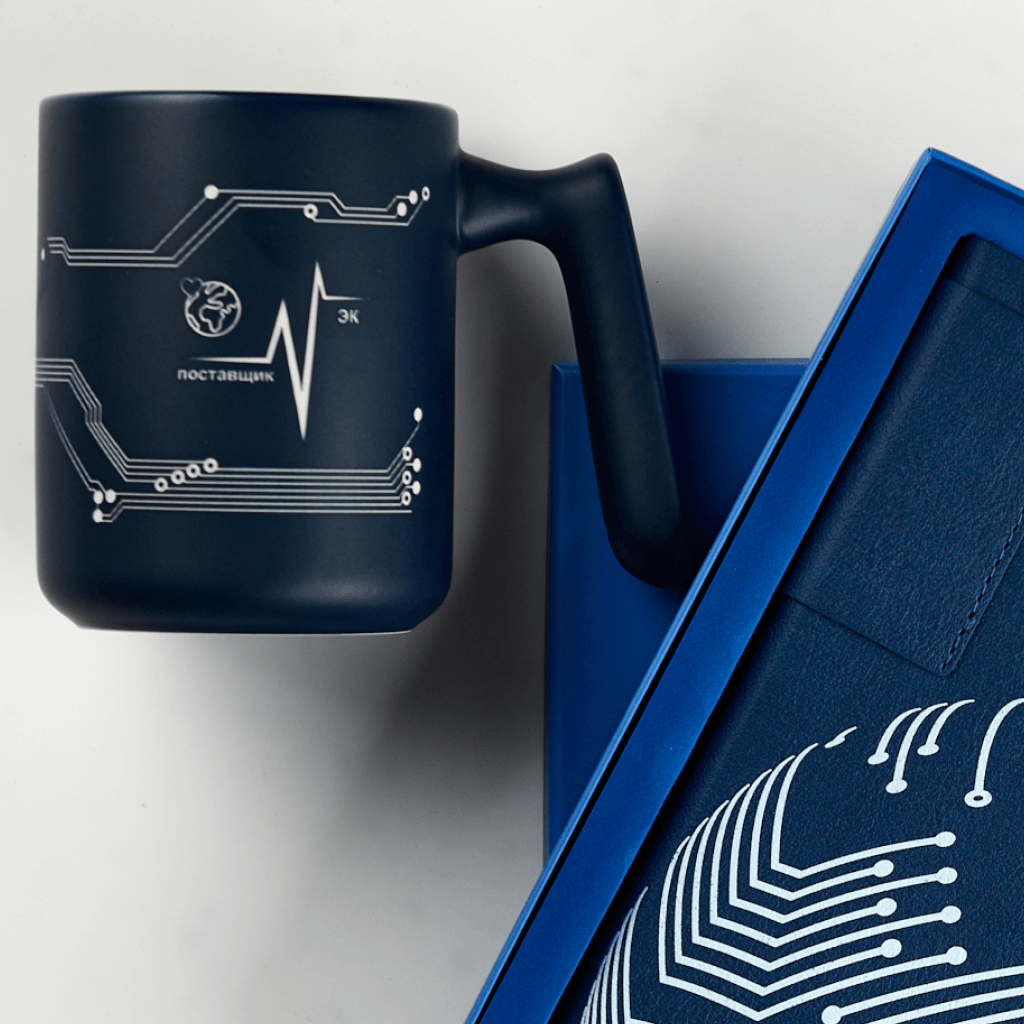 The notebook features a decorative element of the Earth's outline and diagrams to symbolize globality and innovation. Inside there is thick paper, two ribbons and a pocket for a business card. The metal pen in the color of the notepad is laconic and practical. Featuring a matte texture and "ECG + IC" graphics, this mug turns an everyday item into a stylish statement.