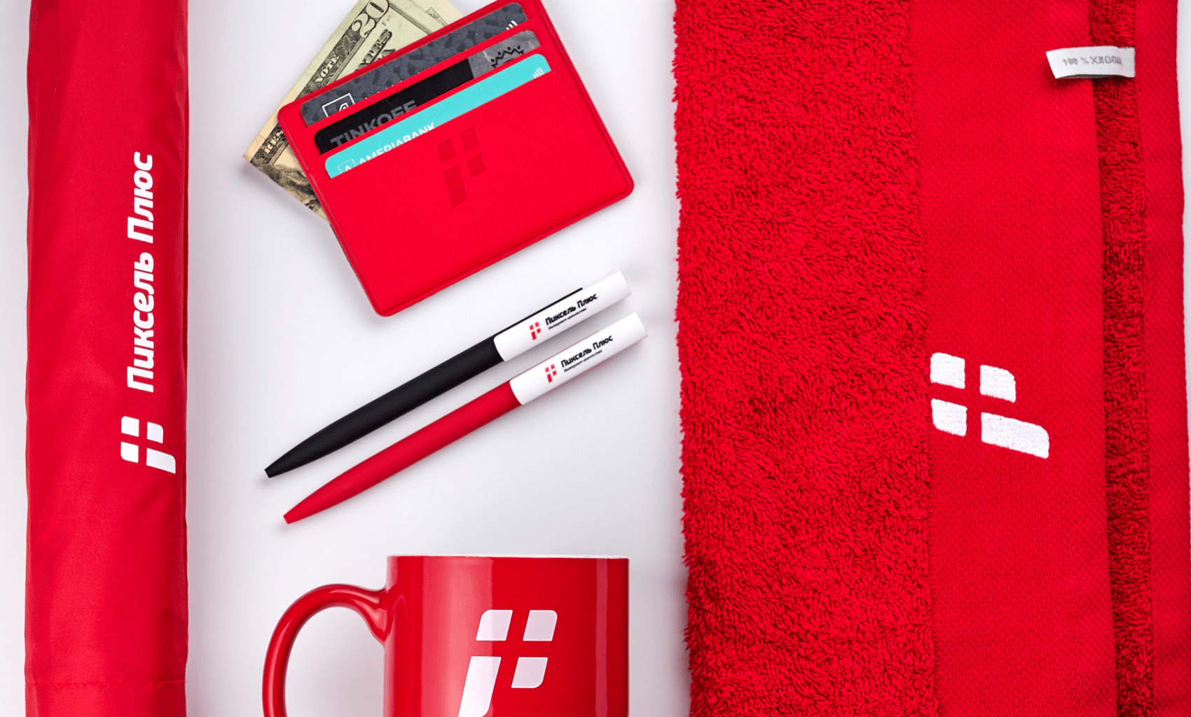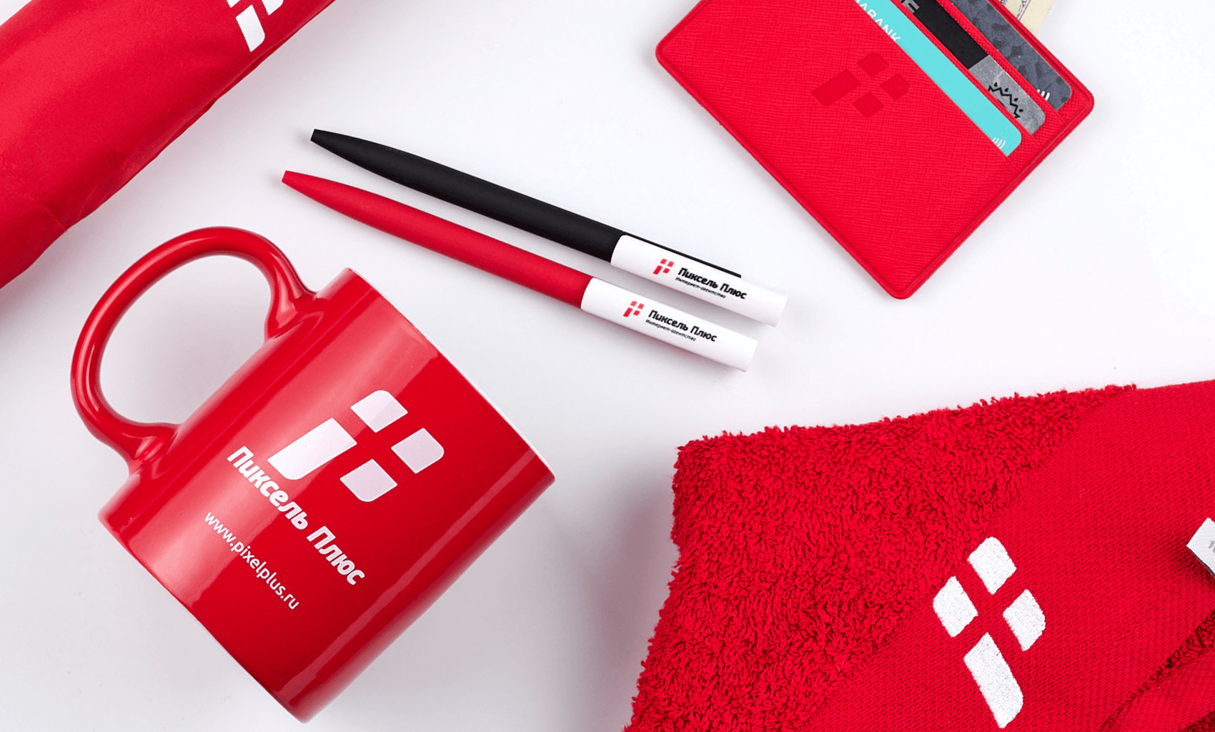 Corporate set: embroidered towel, cardholder, mug and soft-touch pen. Practical merch in red and white colors for daily use by an employee.