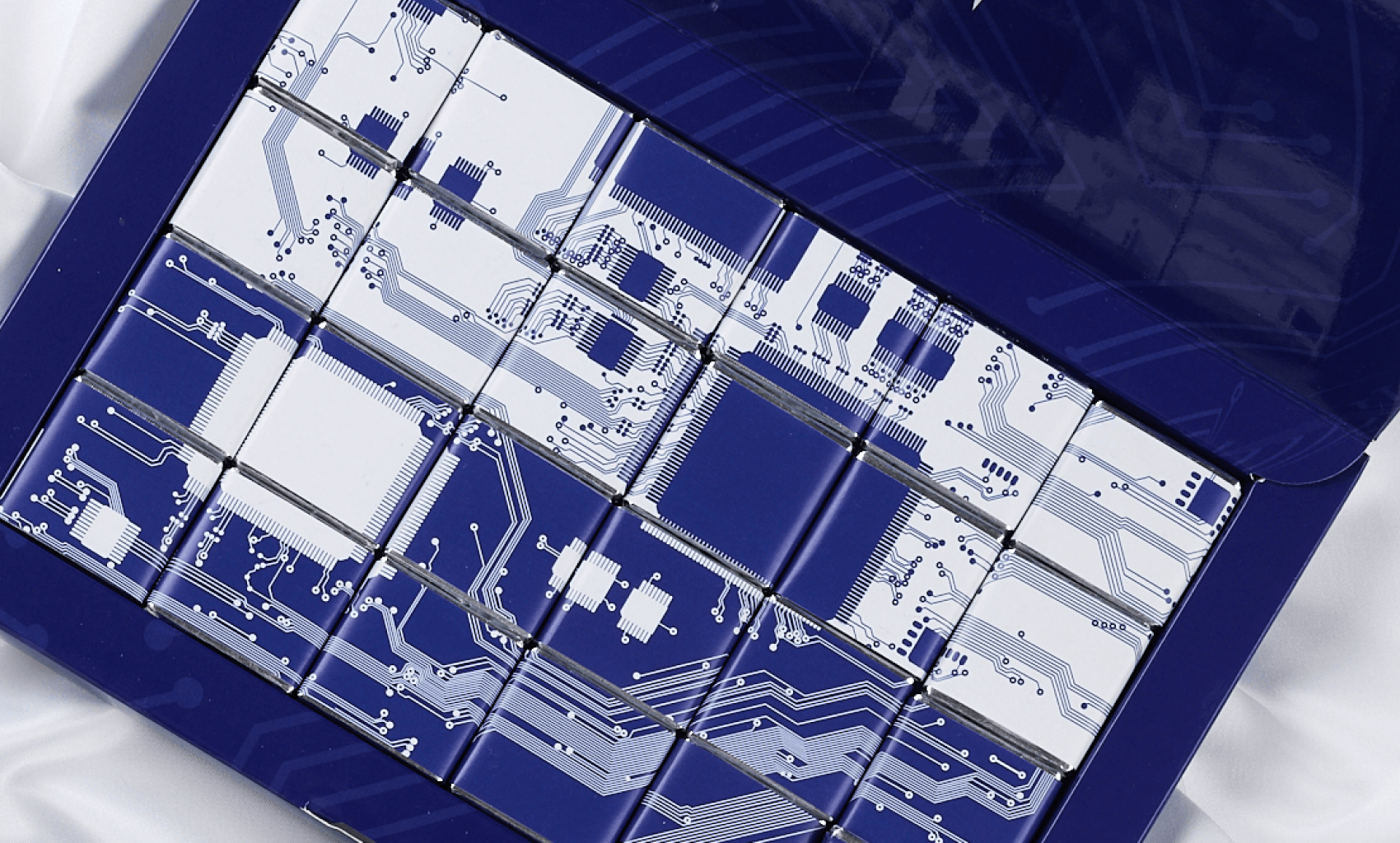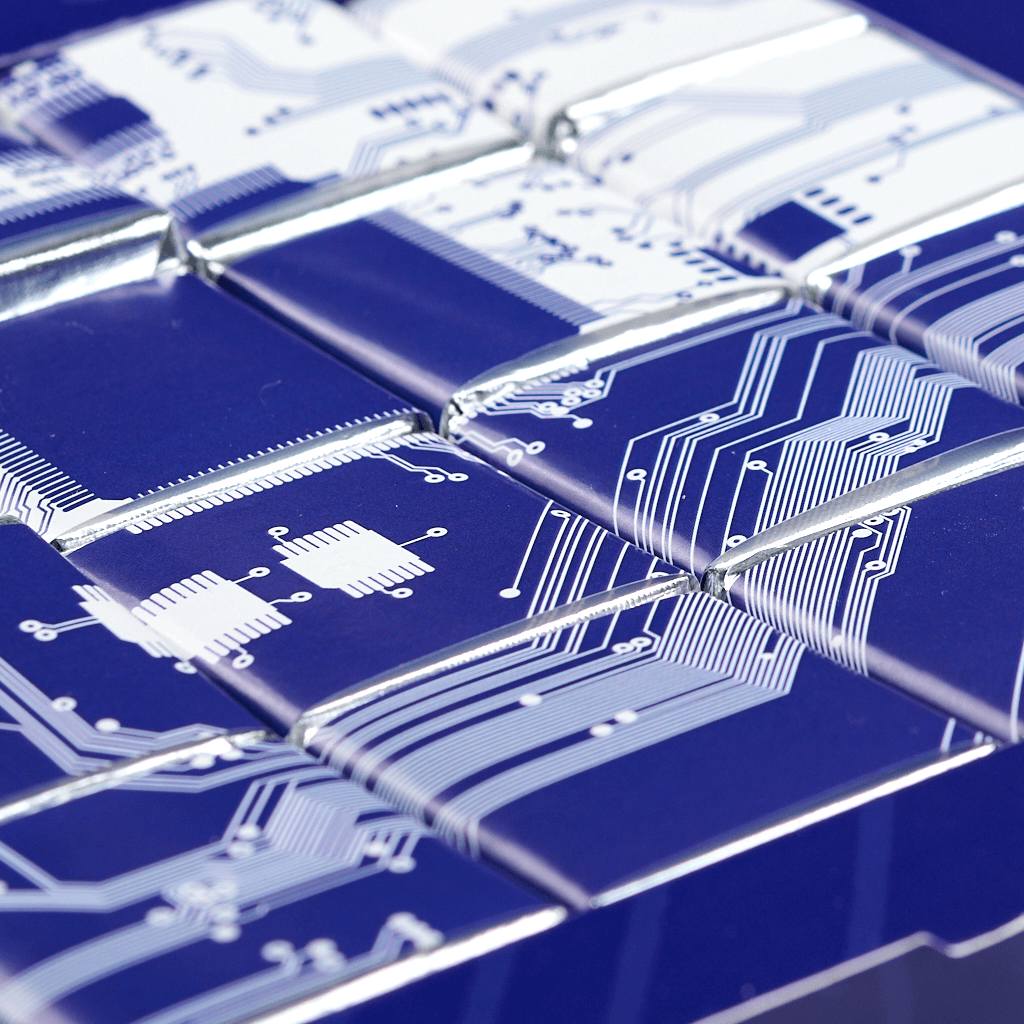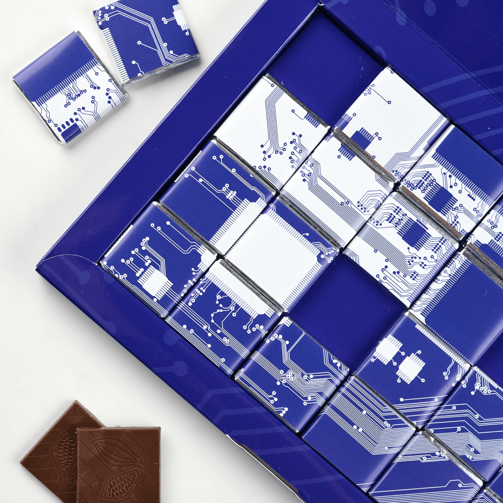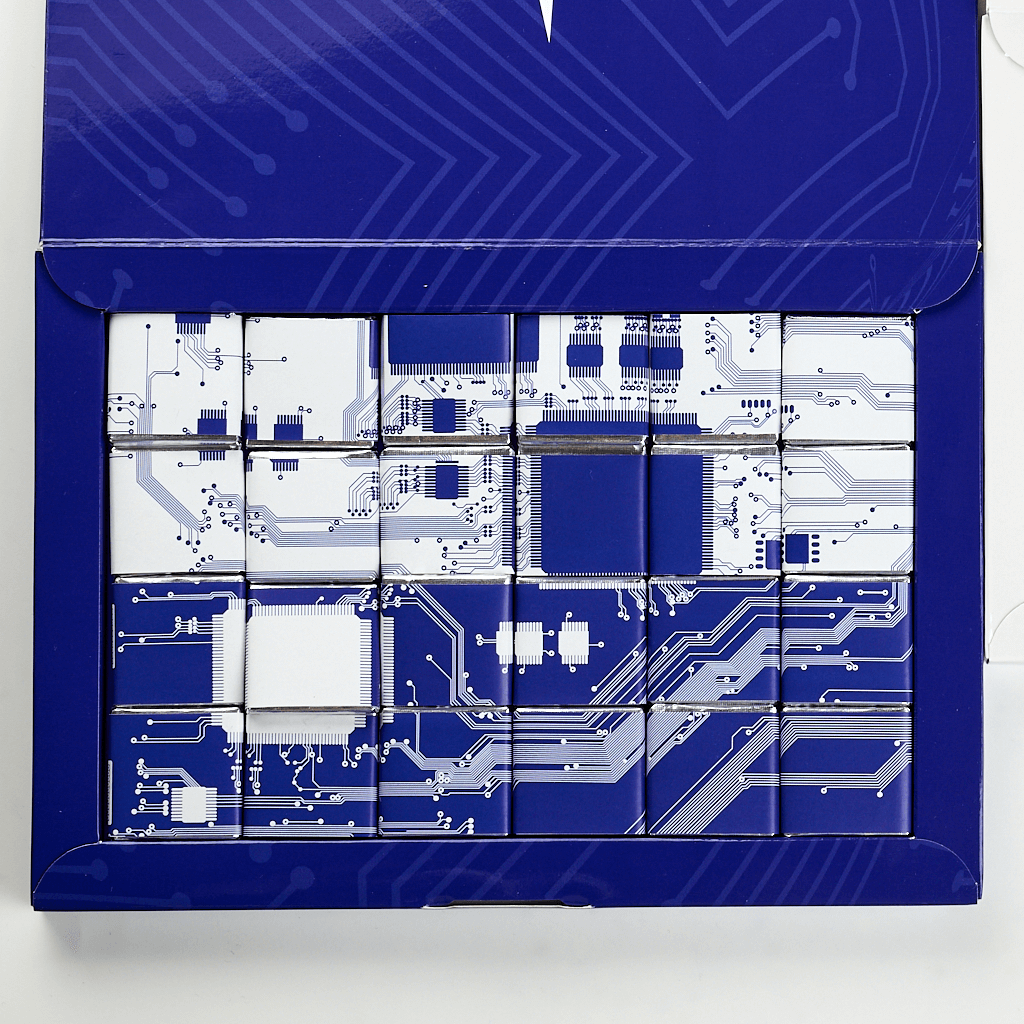 The set consists of 24 5 g bars, packaged in silver foil and branded wrappers with full color printing. The box is made of thick cardboard with CMYK printing and glossy lamination, stylized under the theme of technology and microcircuits. Made to order for your company.