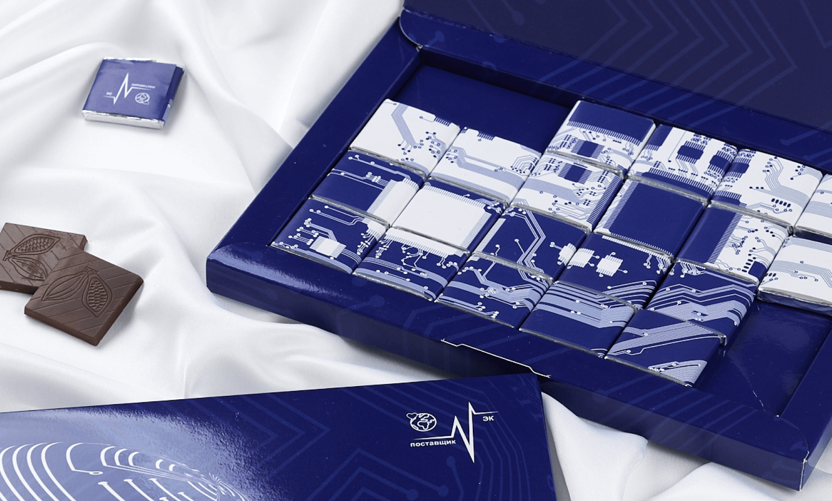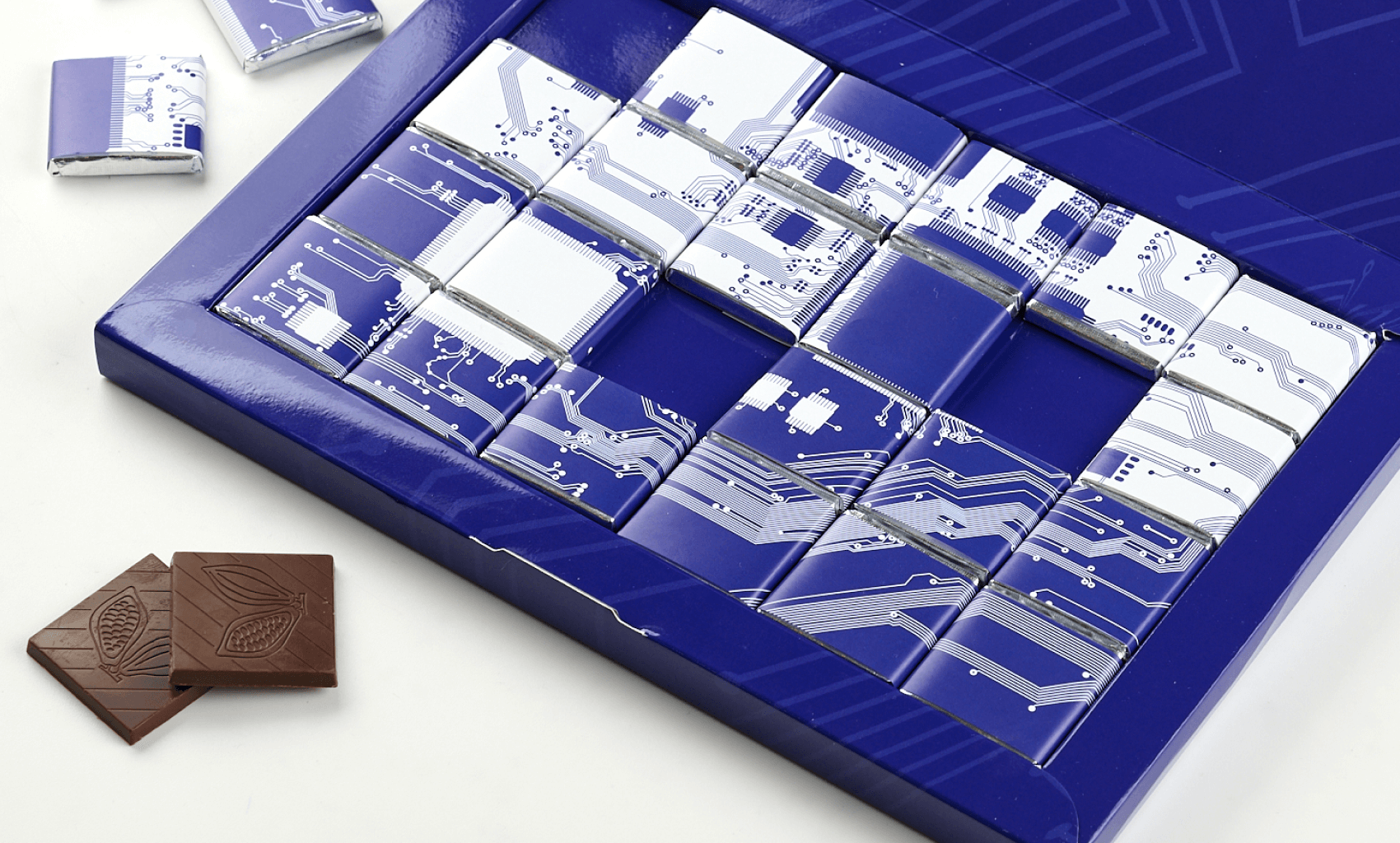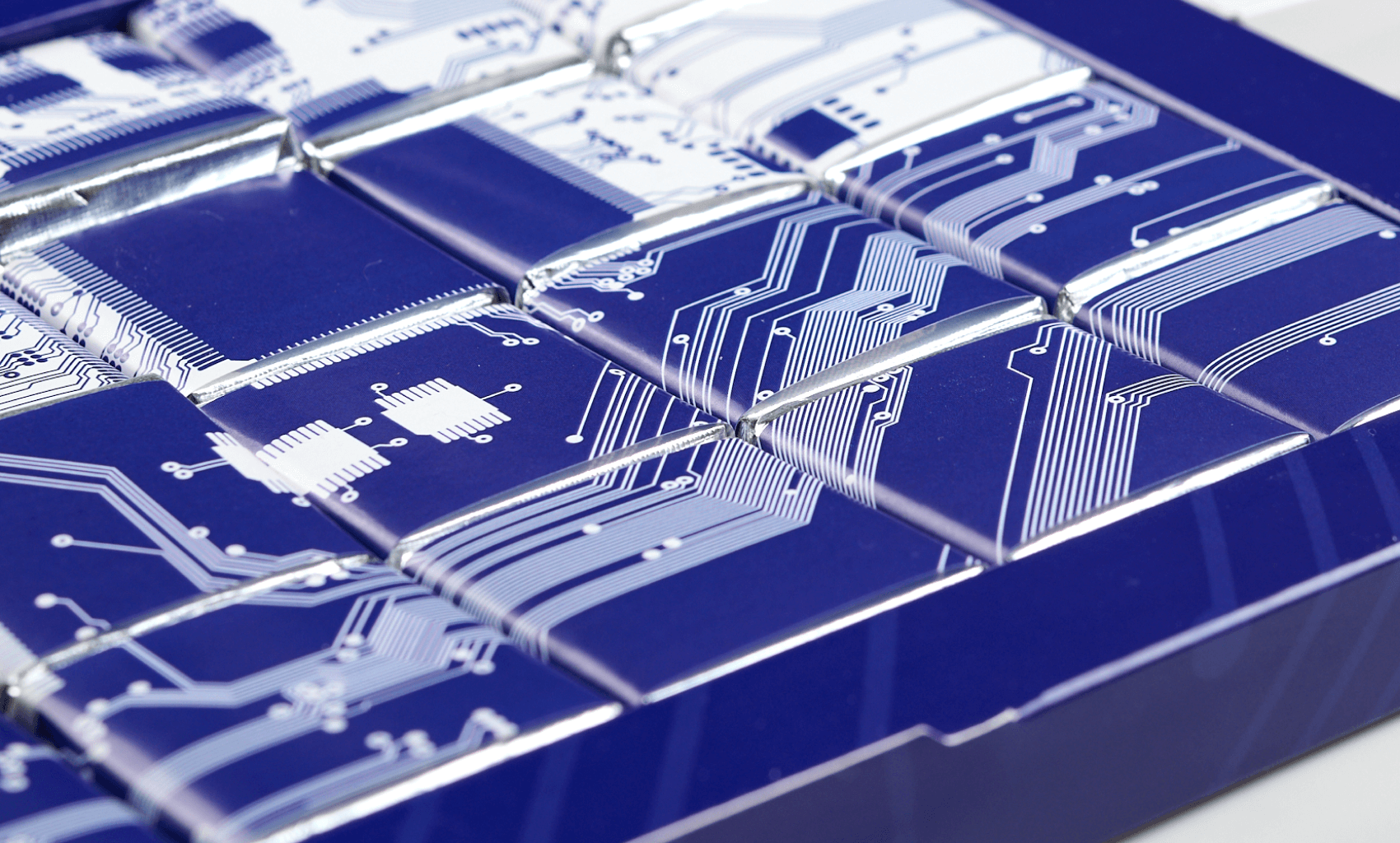 The set consists of 24 5 g bars, packaged in silver foil and branded wrappers with full color printing. The box is made of thick cardboard with CMYK printing and glossy lamination, stylized under the theme of technology and microcircuits. Made to order for your company.