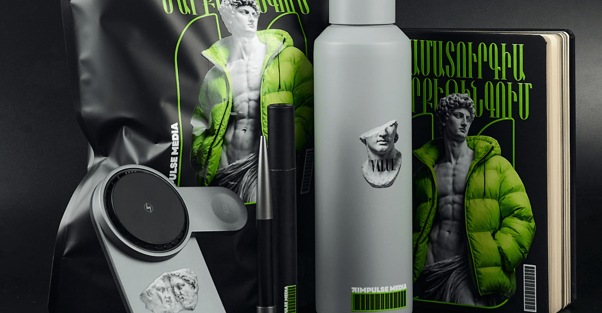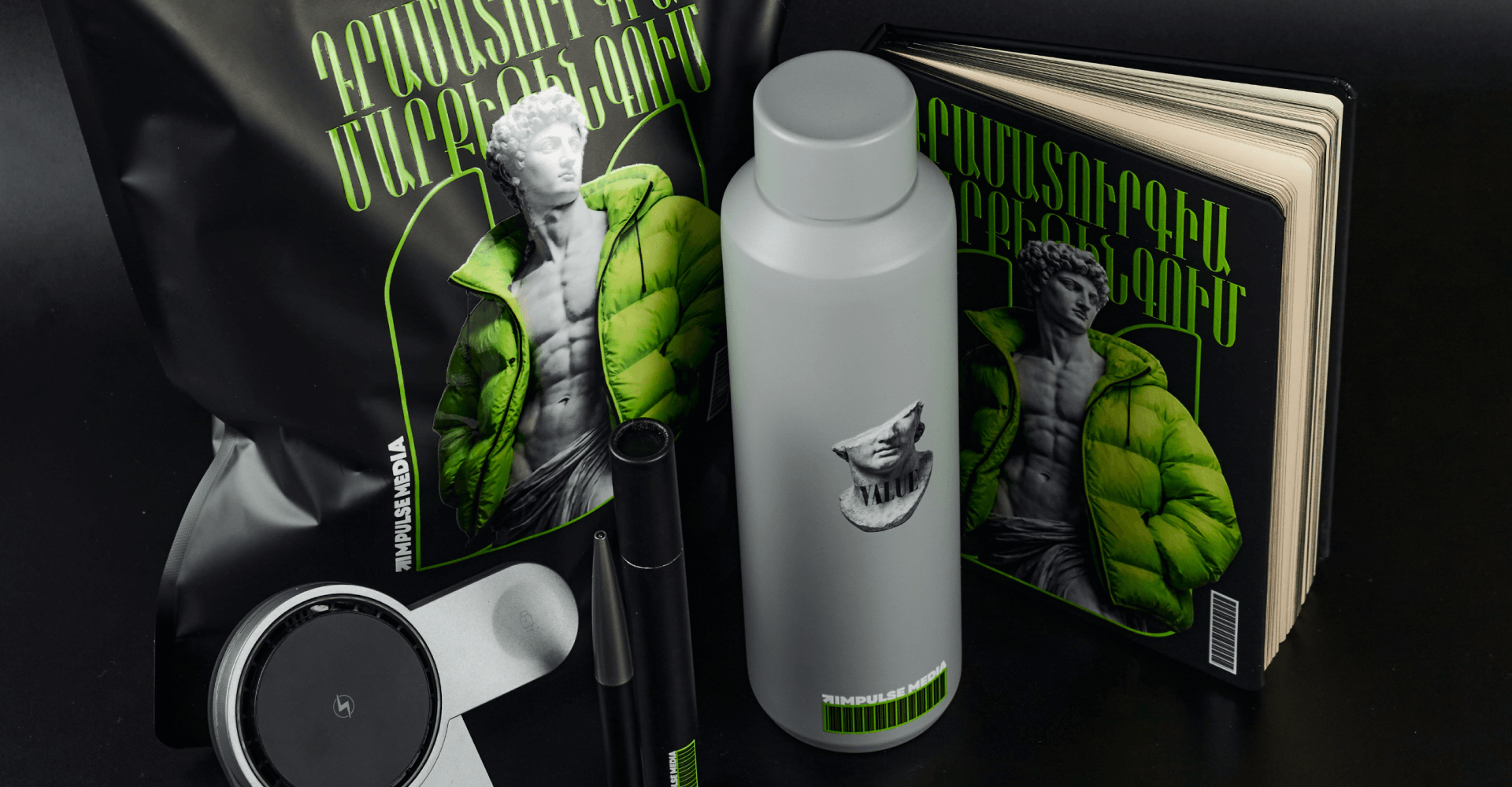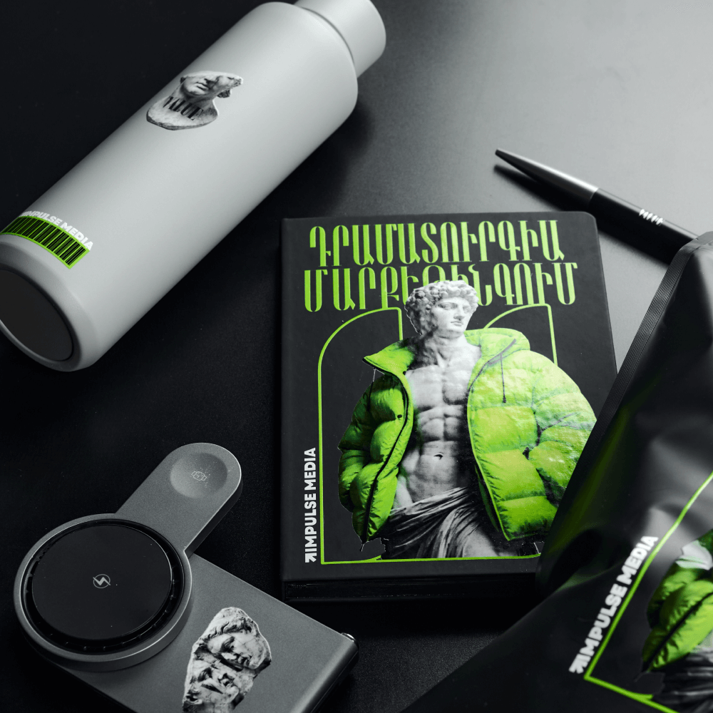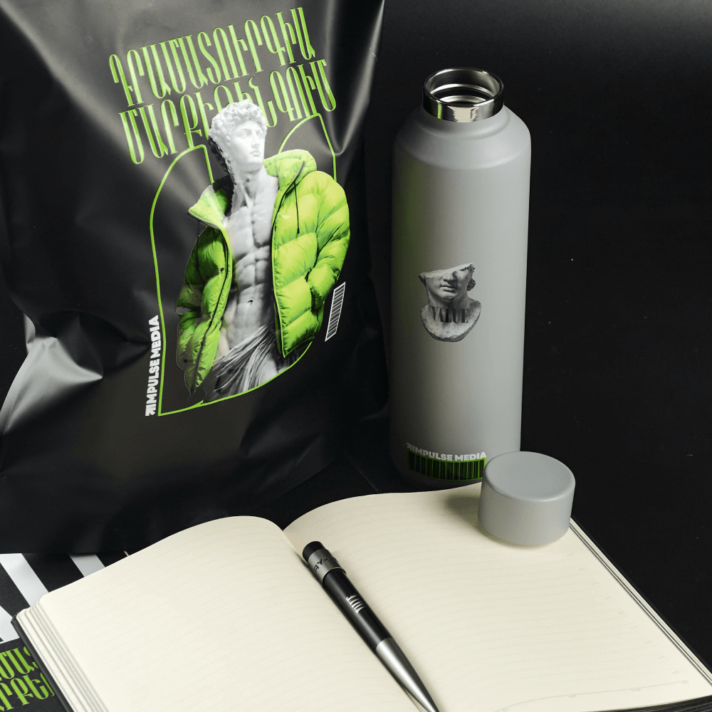 Corporate welcome pack Impulse Media: charger, thermal bottle, mat, diary and pen in a doypack bag. A bright gift and a powerful HR branding tool.